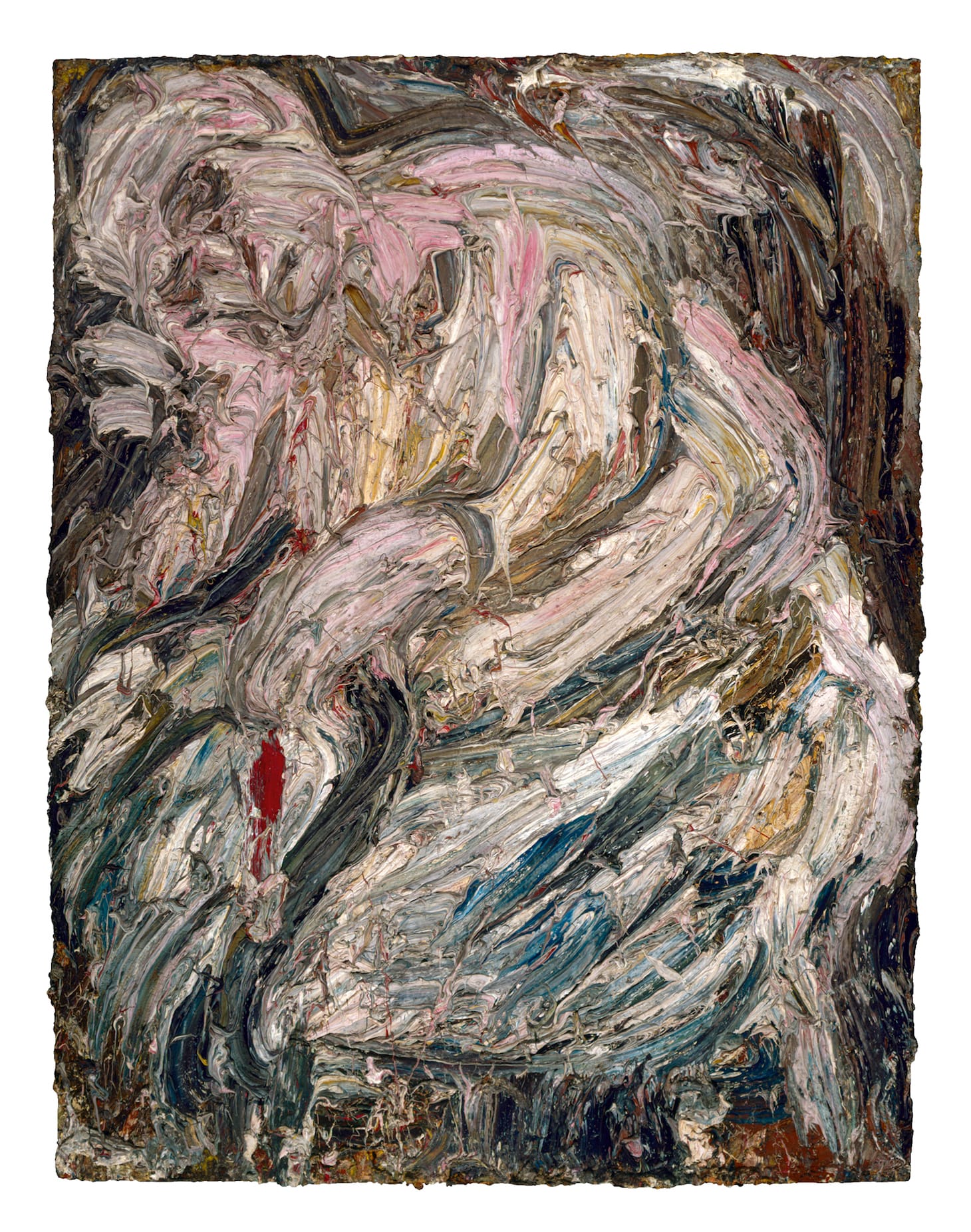 You can see this happening in a painting called “Father Seated in an Armchair No 2” (1960), how blues, red, creams have inveigled themselves. Or consider the preponderance of pink in “Portrait of Mother Asleep” (1963). The paintings are heavily textured, encrusted, as if they are ancient things. He pushes, drags the paint across, leaving deep-gouged, pitted, wounded surfaces. Such a slow turbulence of paint! Such slatherings! For this show, all the frames have been removed. You see the edges of the boards he has been attacking. Looked at side on, you could be staring at a rock on a seashore, encrusted with barnacles. These early portraits seem to be in love with an inner darkness, at one with it. They seem to be wrested from that darkness. The image emerges grudgingly. Bodies are curled, slumped, bowed over, as if collapsed in on themselves. All this closely observed studio work seems to be happening in slow time.