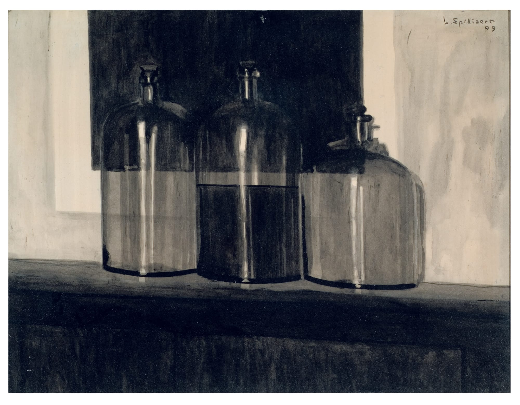 Spilliaert was distinctive in his time for working primarily in a combination of India ink, Conte crayon, watercolor, and pencil or charcoal; the resulting translucency imbues the subject matter with a spectral quality. In “Flasks” (1909), vertical streaks of light pierce through bulbous glass perfume bottles aligned on a ledge, awash in silvery grays — references to the perfumery run by Spilliaert’s parents. The slight angle of the ledge and de-centered black window behind the bottles subtly unbalance the composition, invoking the uncanny in the ordinary.