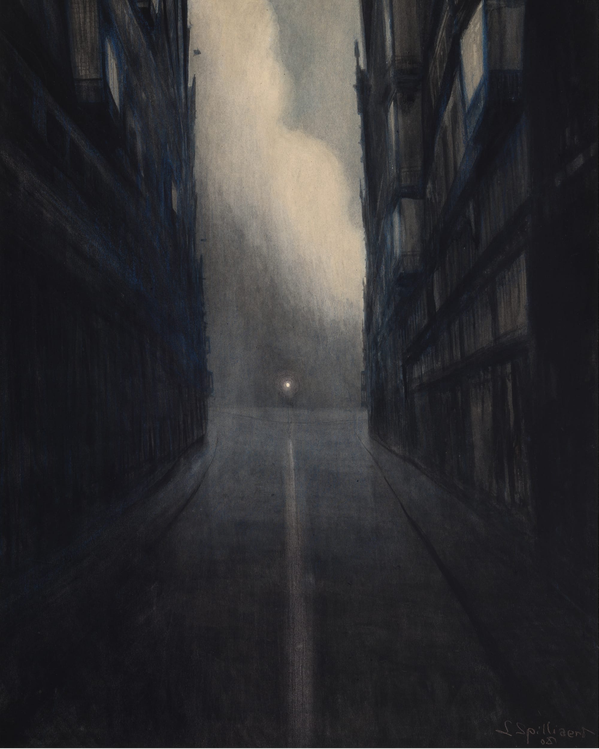 For a painter of darkness, otherworldly light permeates his works. In “Hofstraat, Ostend” (1908), the white glow of a distant streetlamp penetrates a faint shaft of light wedged between two imposing buildings, where a deserted street meets the dusky sky.