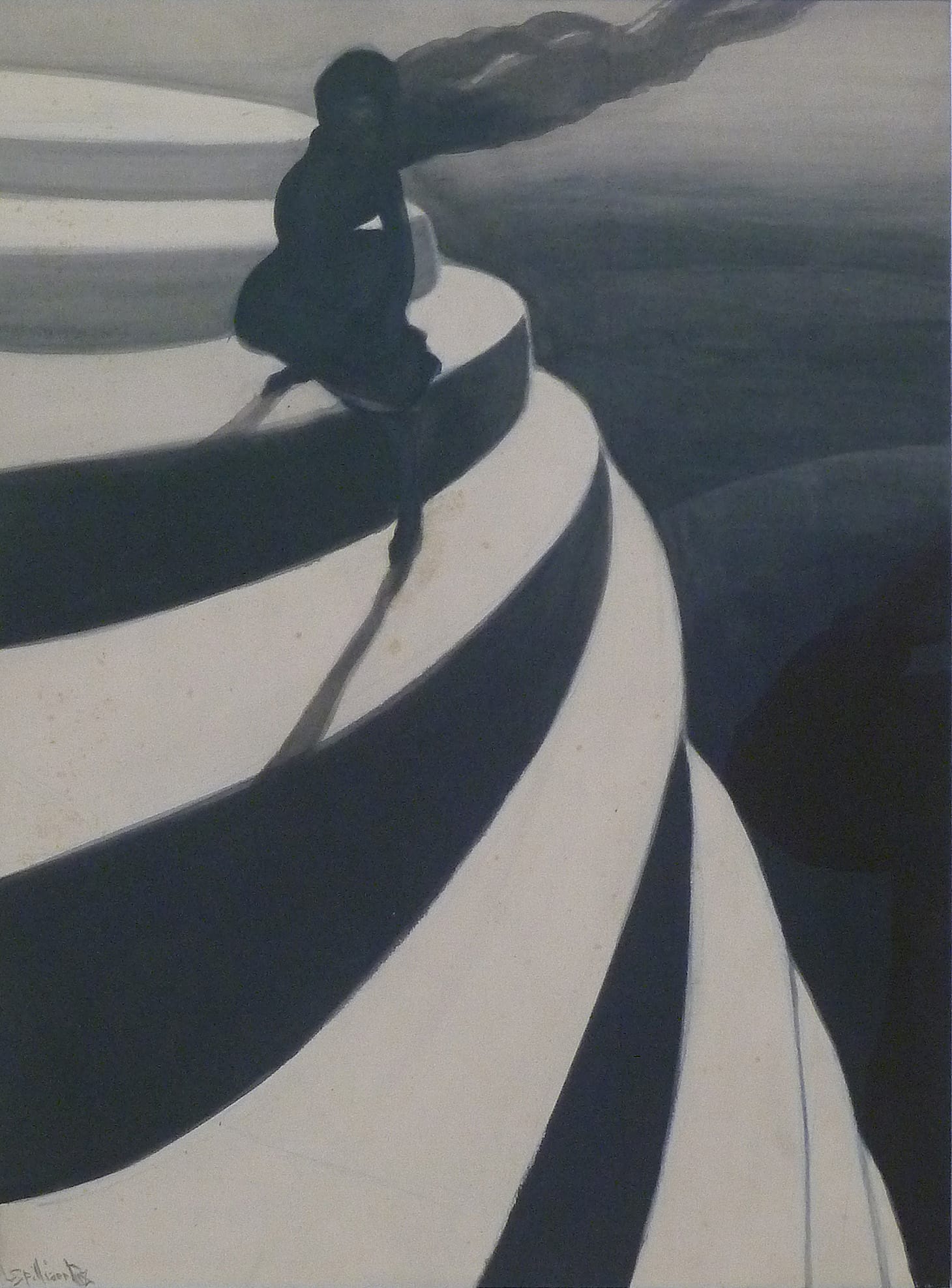 “The Night” and “Hofstraat, Ostend” both incorporate distant vanishing points and starkly converging sight lines. Around the same time, Spilliaert began to experiment with more extreme perspectives and sharp geometries. At their most striking, these works allude to psychological states, as with “Vertigo” (1908), in which he articulates a steep spiral of steps as alternating bands of shadow and light jutting out toward the viewer. A silhouetted woman near the top establishes the monumental scale and precariousness of the precipice, as her gossamer veil flails above a chasm.