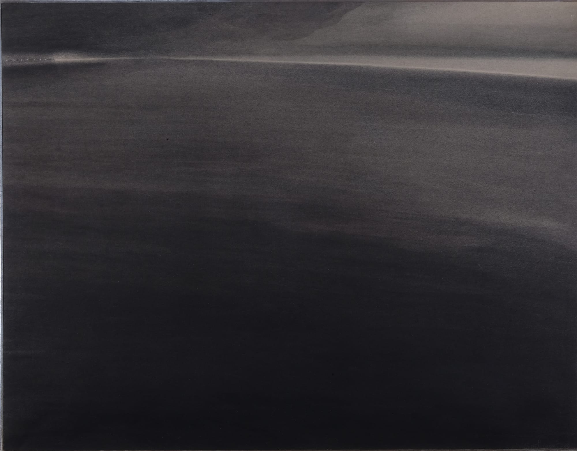 In the work on paper “Seascape Seen from Mariakerke” (1909) by Ostend painter Léon Spilliaert (1881-1946), thin washes of India ink and colored pencil form a vast nocturnal sea that consumes almost the entire space, darkening from silvery gray to deep purplish black. The horizontal flow of the brushstrokes evokes softly undulating waves. A fine white line stretching across the page articulates a distant horizon; above, a veil of clouds gathers in the narrow strip of sky.