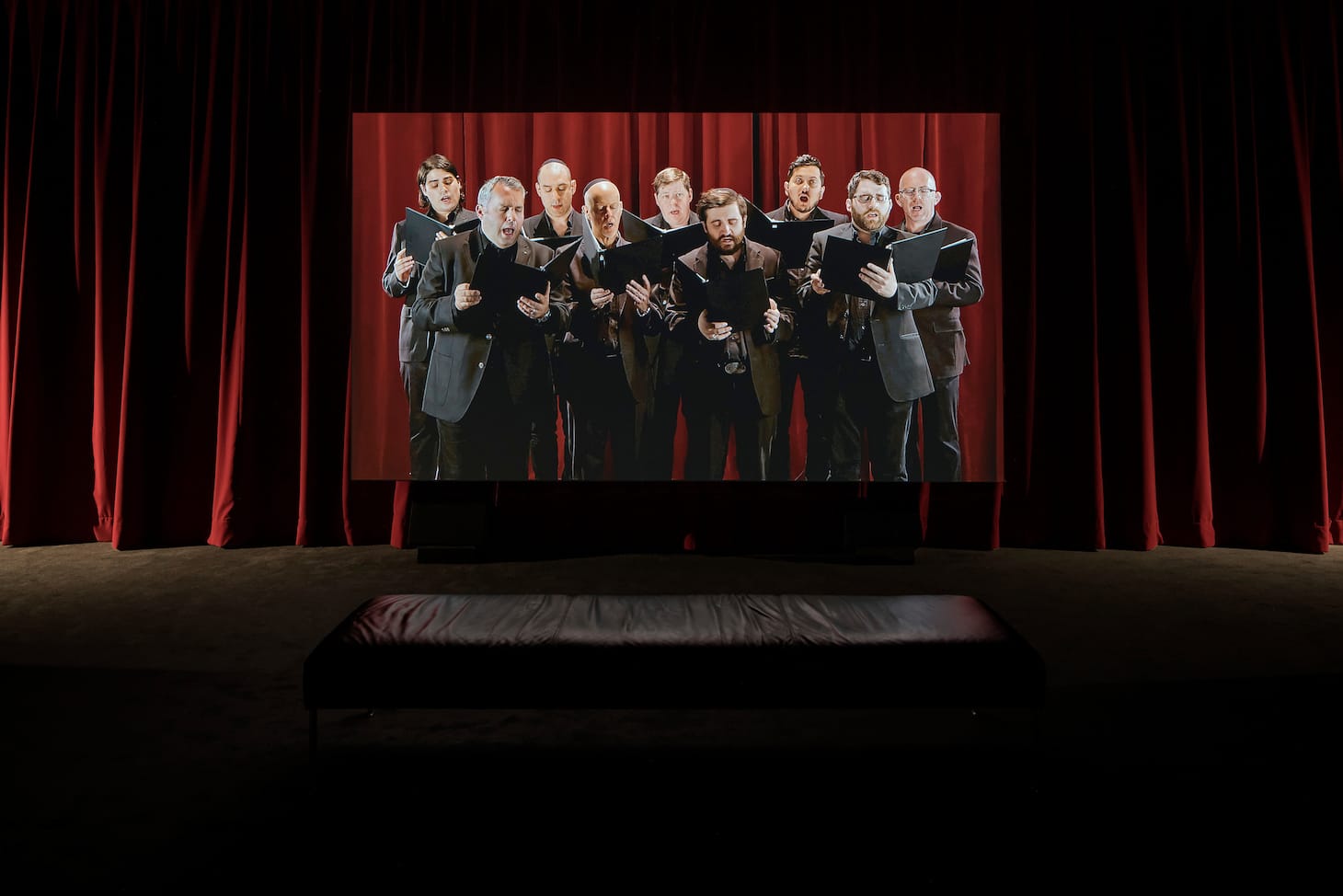 More interesting than art lite — and more relevant to the purposes of art museums — are the moments when the inspired practices of some of the artists shine through. Jon Rafman’s animation “Legendary Reality” sources images from video games to create a phantasmagoric evocation of a metropolis that incorporates Cohen’s poetry and music subtly, without making it the basis of its aesthetic. Candice Breitz, whose work is about fandom and previously took Bob Marley and John Lennon as subjects, contributes a lavishly installed video deconstruction of Cohen’s 1988 album I’m Your Man featuring a synagogue choir that sings the album’s backing vocals in front of a velvet curtain, behind which various sexagenarian-plus men sing the lead vocals. The effect is eerie, and unsettles rather than advertises Cohen’s music.