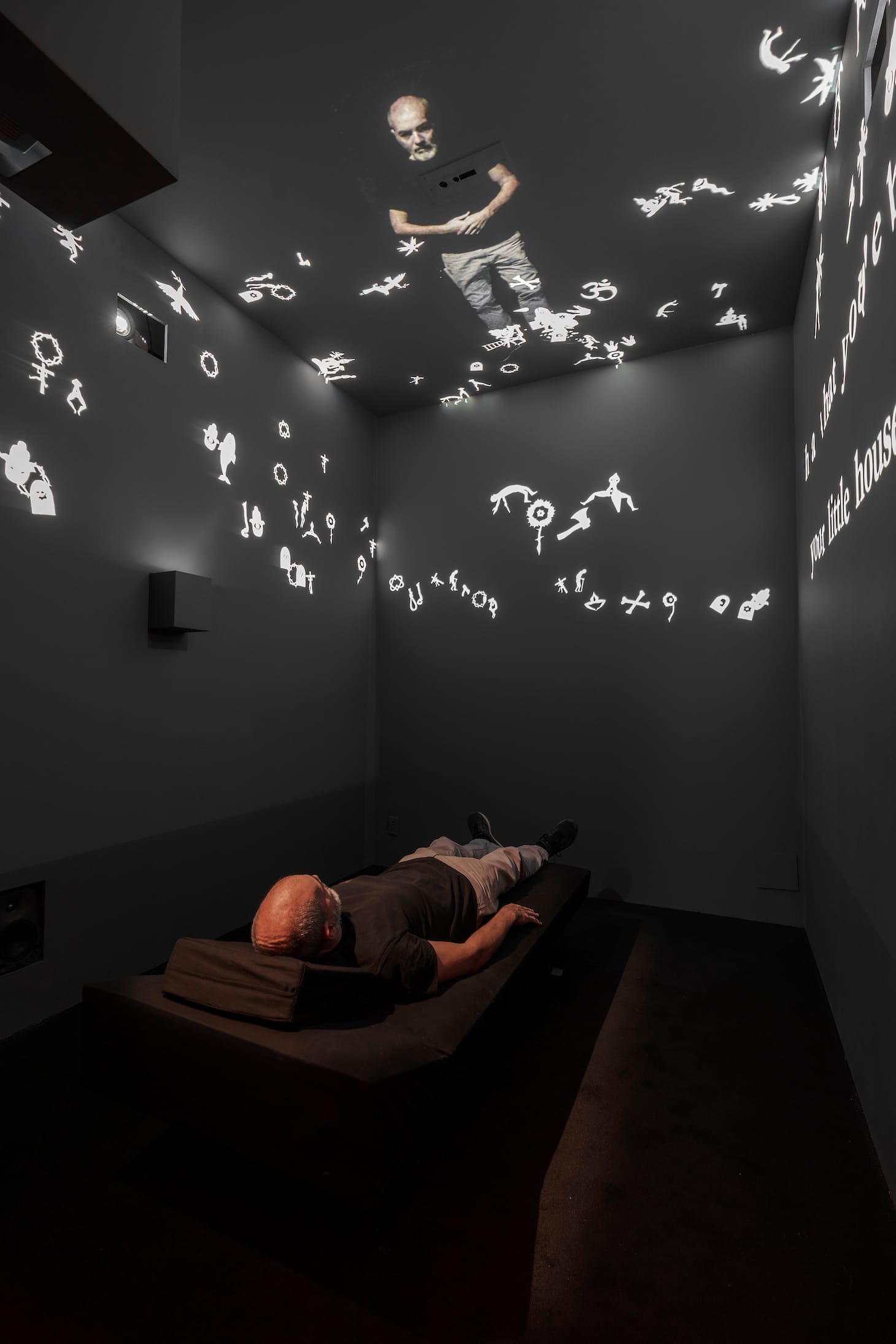 When works rely on his music, they too often debase their own artistic motives and achieve something kitschy. Across the hall from Blake’s piece is a by-appointment-only installation called “Depression Chamber” by filmmaker Ari Folman, which, according to the wall text, addresses “the debilitating nature of loss, suffering, and depression.” The museumgoer walks into the chamber and lies down in its center, a live video feed projecting the visitor’s image onto the ceiling. In the darkened space, there is a moment of solitude within the otherwise crowded confines of a Manhattan museum, the emptiness of the room offering a real opportunity for self-reckoning. Then Cohen’s 1971 song “Famous Blue Raincoat” begins to play and animated figures start floating up the walls. The work renders the “debilitating” set of conditions mentioned in the wall text into something cute, harmless and interactive.