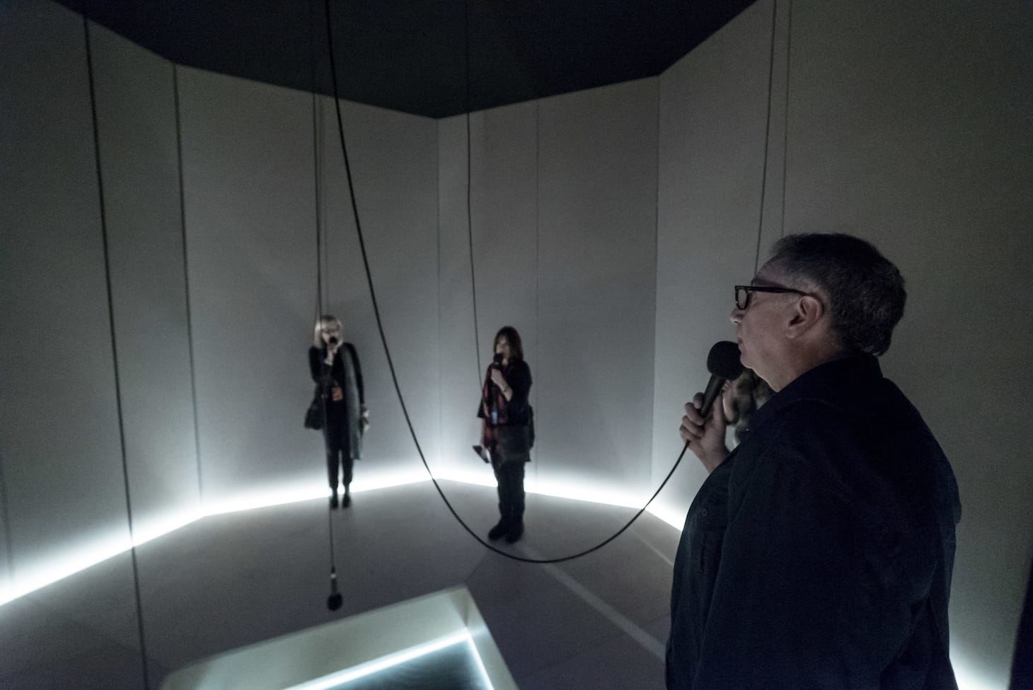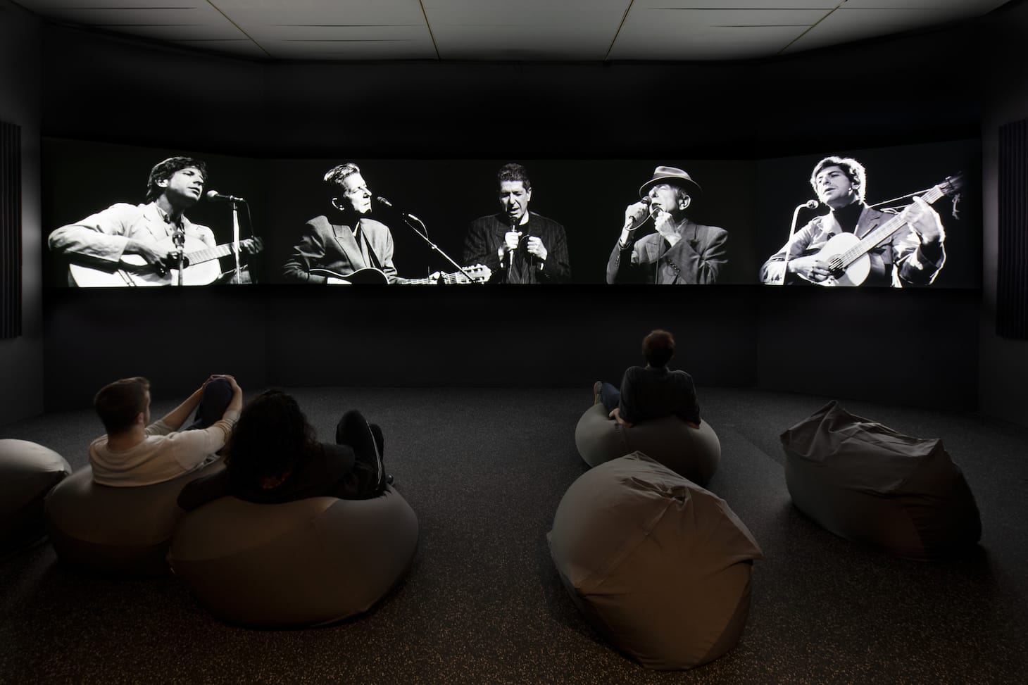 The second floor centers around an installation by the design studio Daily Tous Les Jours. Microphones hang over an octagonal arrangement of benches. Museumgoers are invited to hum Cohen’s much-beloved song “Hallelujah,” a digital display above counting the number of participants, which include people who visit the website asecretchord.com and contribute their own voices to the chorus.