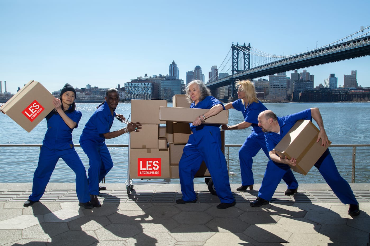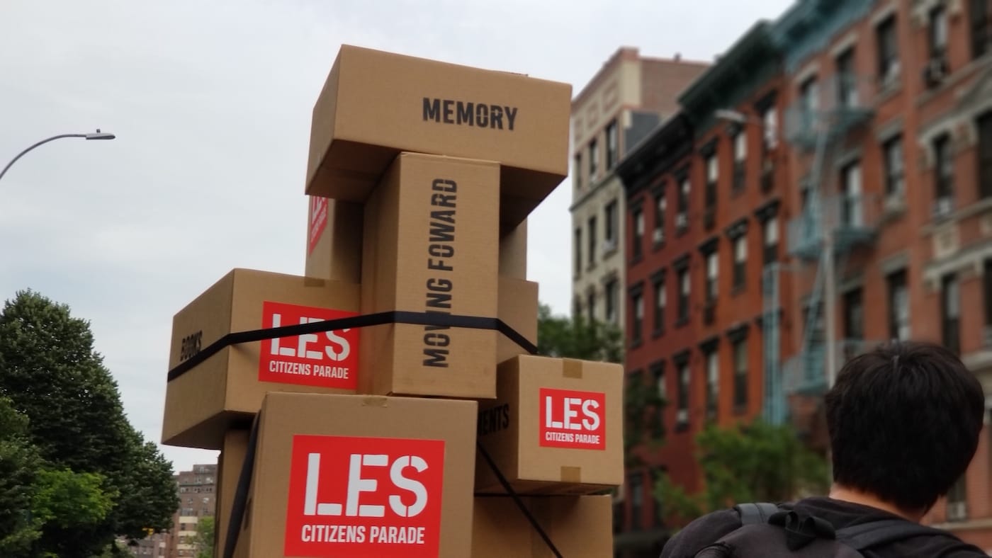 At the LES Citizens Parade, senior citizens of Chinese, Hispanic, and Jewish descent pretend to be a moving company, surrounded by cardboard boxes that carry immigrant stories.