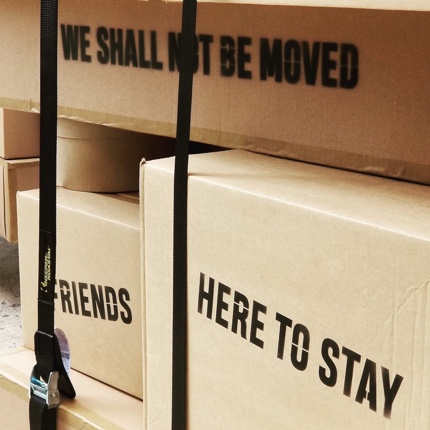 The boxes are inscribed and metaphorically filled with the stories that participants shared with workshop organizers over a five-month period. “Floats,” or moving carts, are stacked high with cardboard boxes labeled with phrases including “We Belong Here,” “Legacy,” “Determination, and “Resilience.”