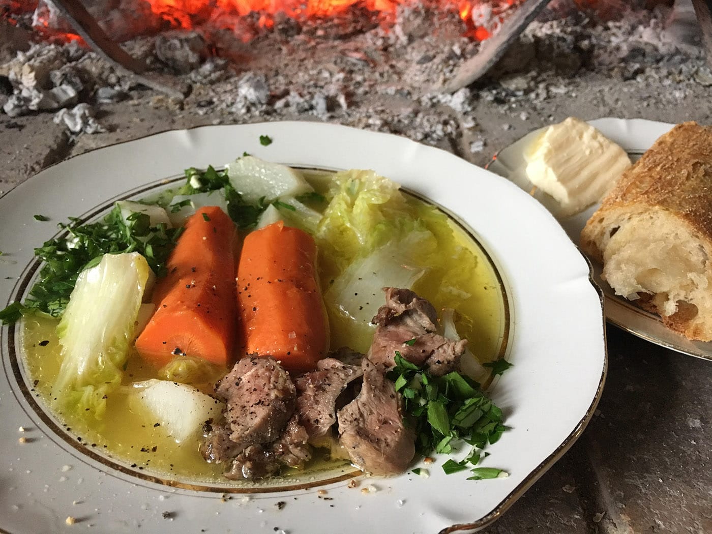 At this point, ladle enough broth for your lunch into a smaller pot. Add a cabbage wedge, and sliced turnip and carrot. Boil until cooked through. Meanwhile quickly sauté the little duck tenders in a little duck fat or butter. Slice. Arrange your vegetables and meat in a soup bowl. Pour the broth over it, then garnish generously with parsley leaves and garlic chopped together with some course salt. Pepper? Yes. A splash of Armagnac doesn’t hurt either.