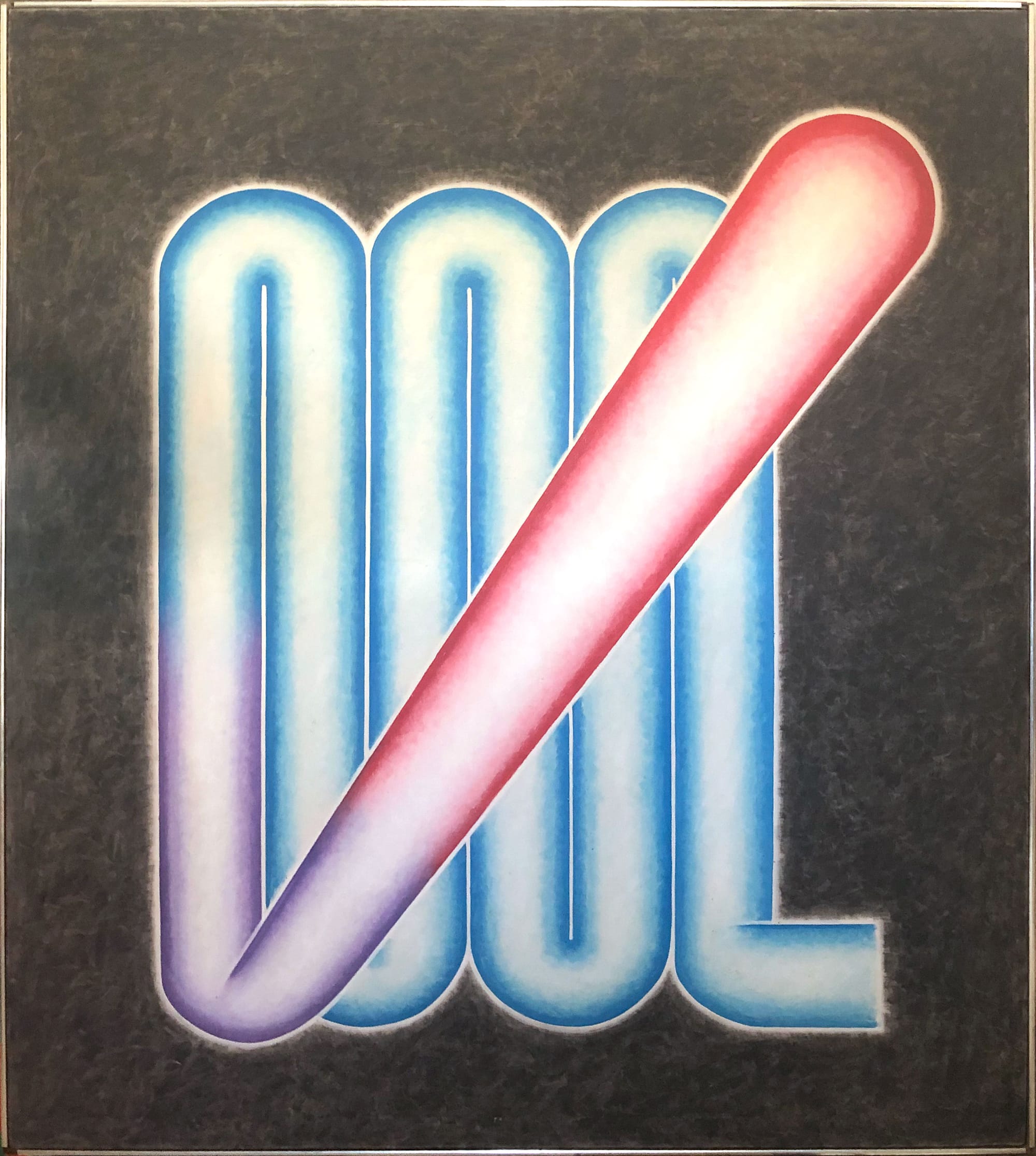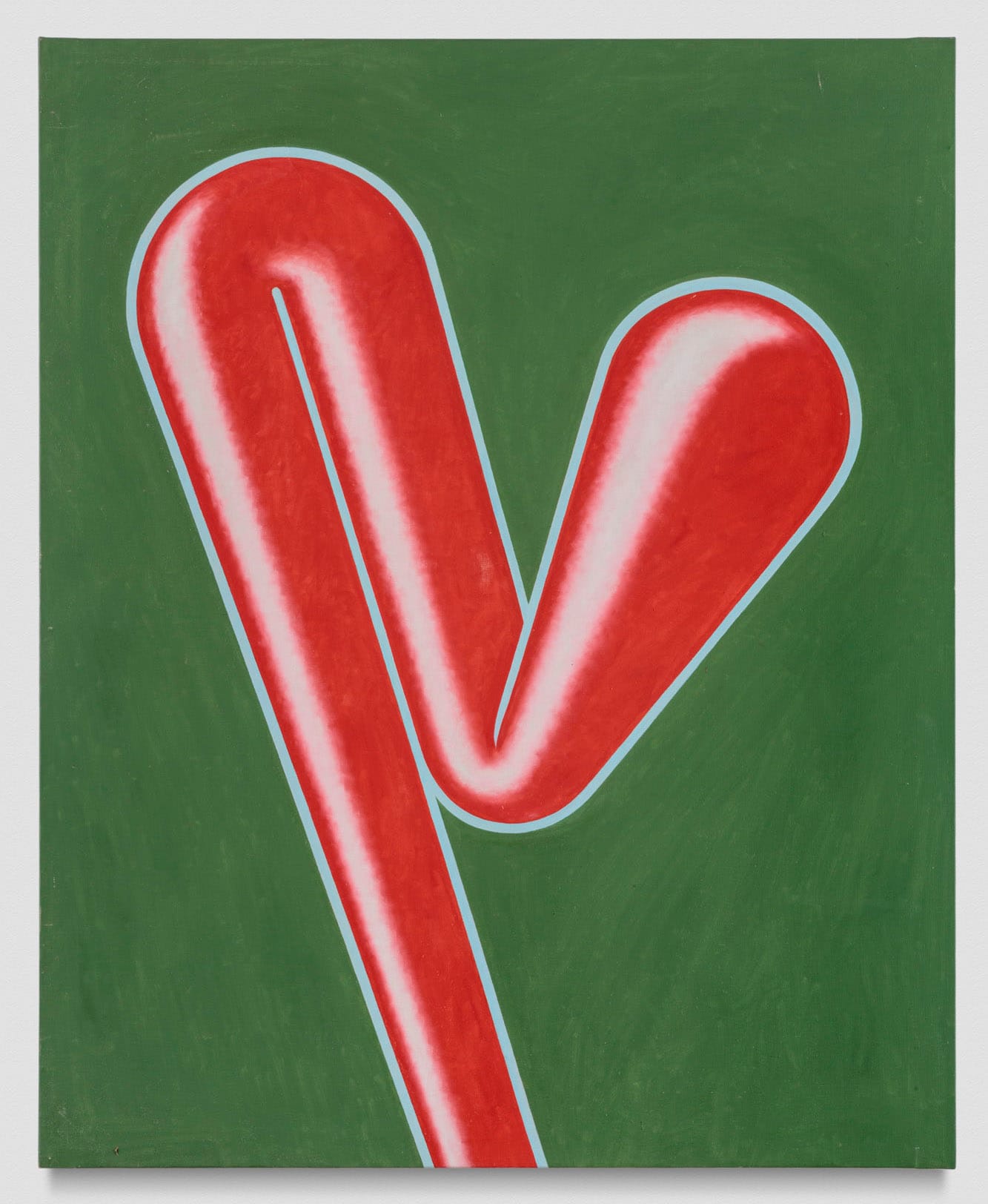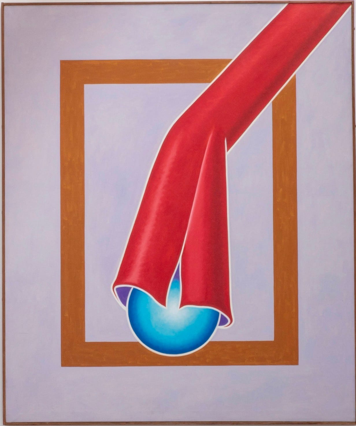 Bending and folding his tubular forms seems to cause the closed end to swell, through which Kerr evokes a comic tension between flow and freeze, movement and blockage, and all the ways that stress might be read in bodily terms. In “Lover #2” (oil on canvas, 56 x 50 inches, 1964), the tube starts on the painting’s bottom right edge, rising and descending vertically, like a radiator, until it abruptly crosses diagonally back over itself. Kerr accentuates this by first edging the form in blue, turning the final descending band purple in the bottom half, and then red as it rises and swells, culminating in a swollen, baseball bat-like shape.