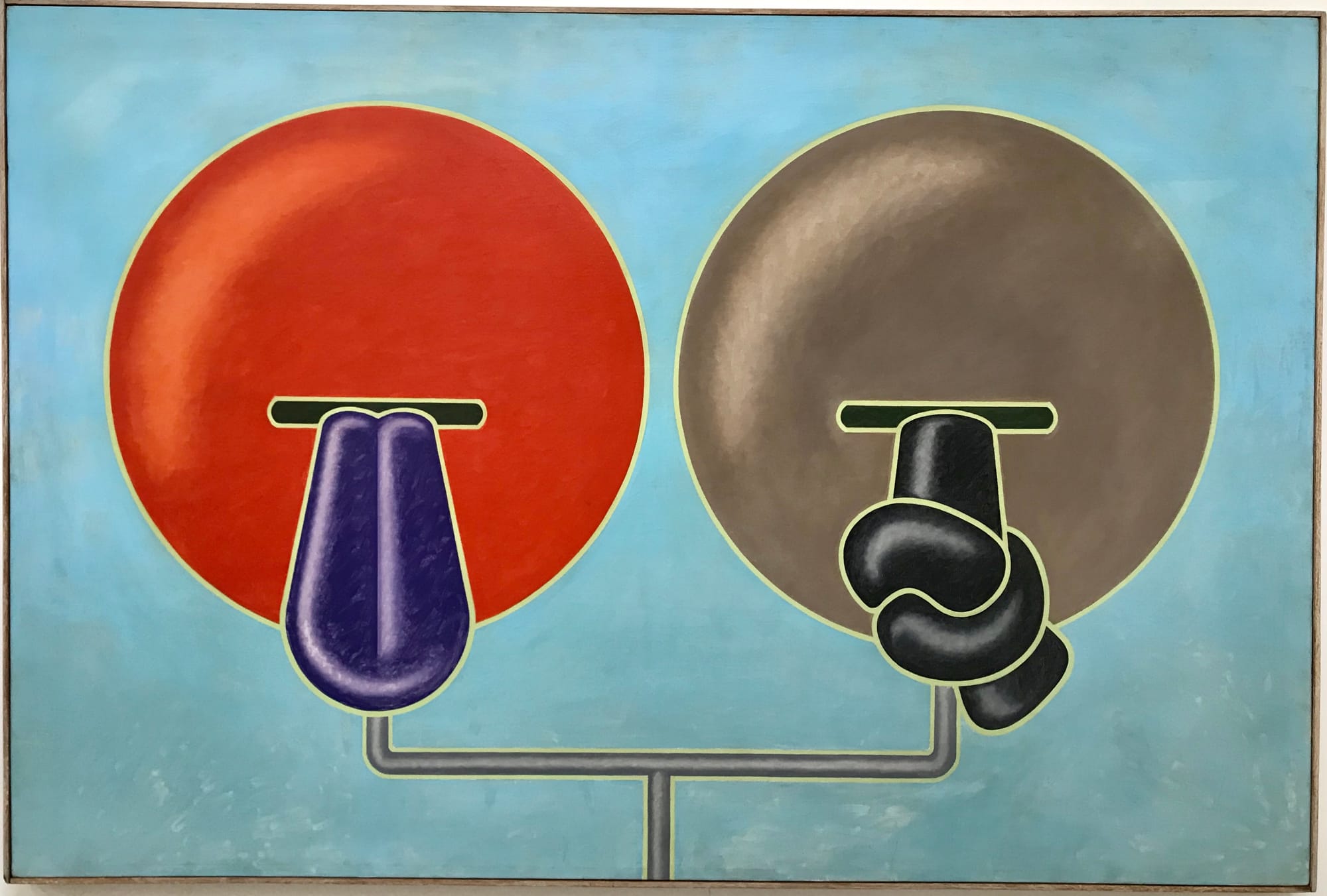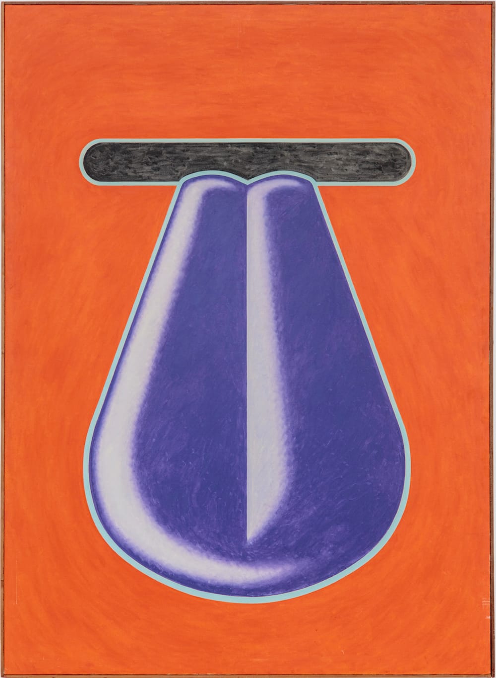 By bending, twisting, and swelling the forms, he animated their presence. The swelling form that appears in “Twins” (oil on canvas, 48 by 72 inches, c. 1964) and “Raspberry” (oil on canvas, 68 by 50 inches, 1964) resembles a cartoony, grape-colored tongue extending from an outlined slot.