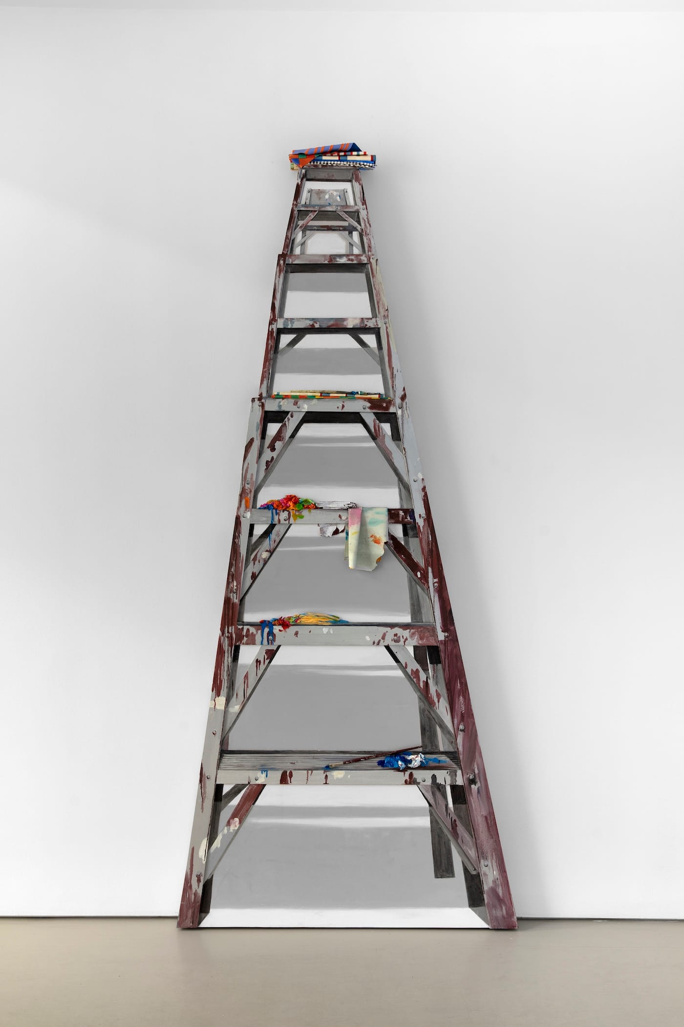 We approach “Planetary” at an oblique angle, imagining it to be just another scrappy ladder resting on the floor, albeit, possessing a rather aesthetic scrappiness. So convincing is Wayne’s fabrication of reality, that only on closer inspection do the surface anomalies and spatial incongruities begin to reveal the fiction of the object. She is a master of the details that suspend the viewers’ disbelief just long enough to hold them in an intimate encounter: tromp-l’oeil shadows that cast on the “wall” behind the ladder, and the loose screws that hold it together; a folded white cloth with flecks of brown paint and colorful bundles of mushed-up paint rags on its steps; a tidy pile of striped and plaid cloths ornamenting the ladder’s zenith (whose perspective is exaggerated to heighten its monumentality). The evident playfulness and humor of these illusions belie their meticulous construction, culled from a compelling toolbox of painterly tricks developed by the artist over three decades.