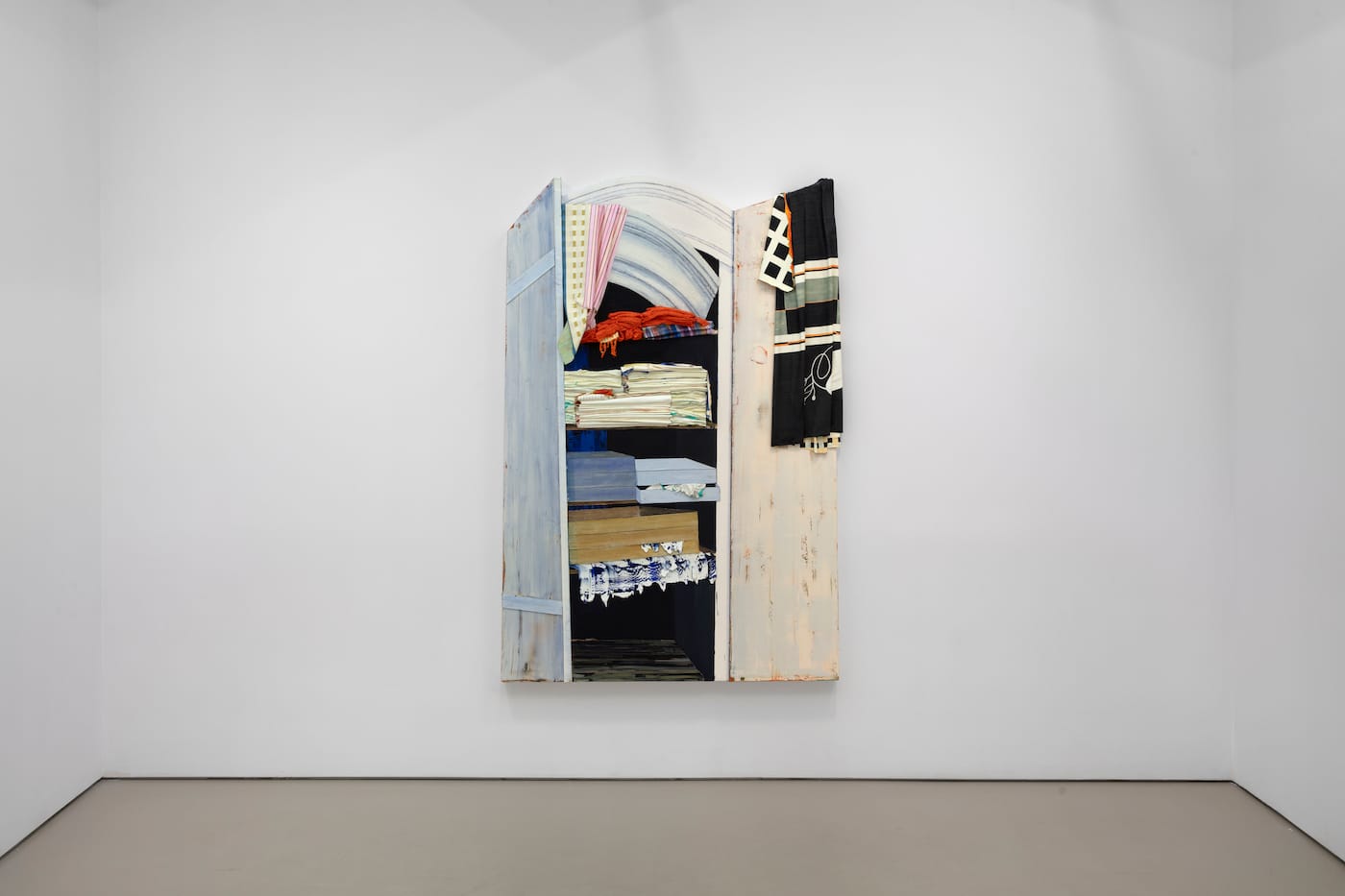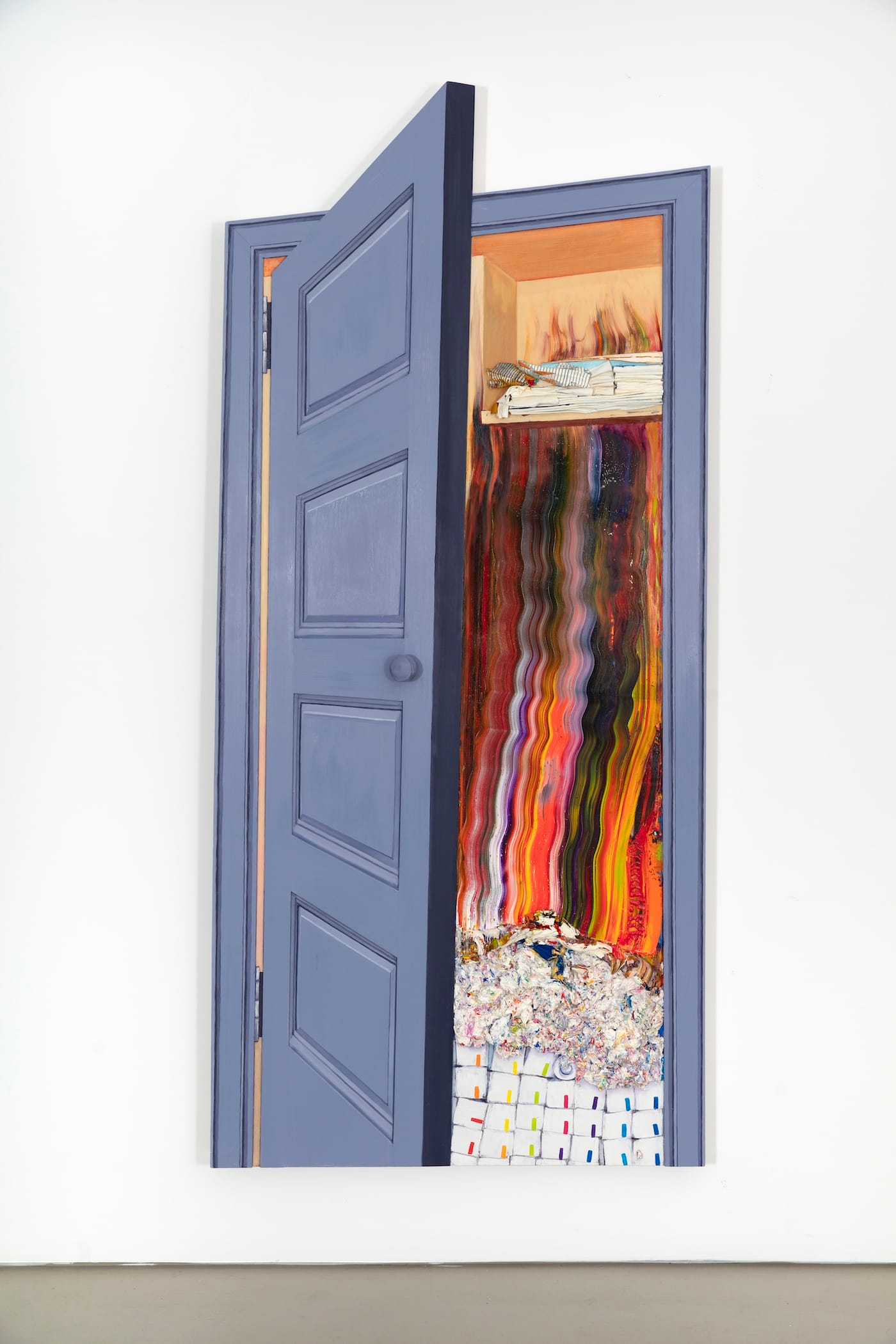 The architectonics of Wayne’s structures mediate the in-between space of impermanence and maybe even point to a poetic expression of loss. Duality reveals itself in the slippages between numerous dialectical manifestations: open/closed, illusion/reality, absence/presence, painting/sculpture, abstraction/figuration, among many others. Wardrobes, chests, and doors are all slightly ajar, revealing both literal and metaphorical situations. The most fictional of these, “Burning Down the House,” depicts a powdery-blue door complete with a doorknob, which partially opens to reveal a closet. Stacked at the bottom of the closet are paint tube boxes, and atop of them are what appear to be crumpled-up cotton paint rags rendered in masses of impasto paint. The rags are engulfed in flames, which leap upward in an angry stream of fluorescent hues, until they’re licking the neatly folded rags on an upper shelf. It’s impossible not to feel an undercurrent of political anxiety, born of American hubris under Trump, and the subsequent crisis of art. These themes foster a palpable strain in this work and throughout the entire show.