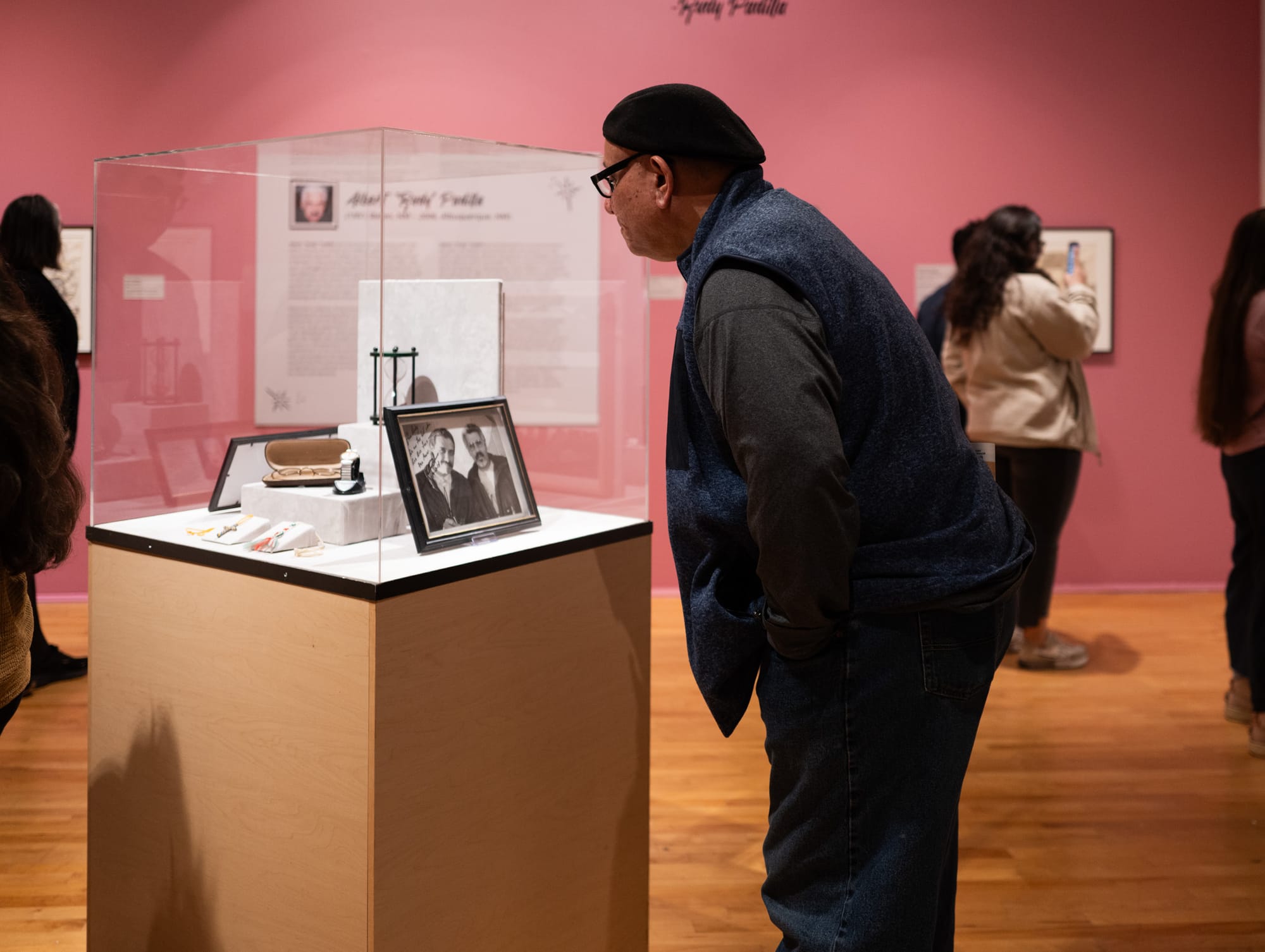 Visitors at the opening of Into the Hourglass: Paño Arte from the Rudy Padilla Collection at the National Museum of Mexican Art in Chicago (photo courtesy NMMA)