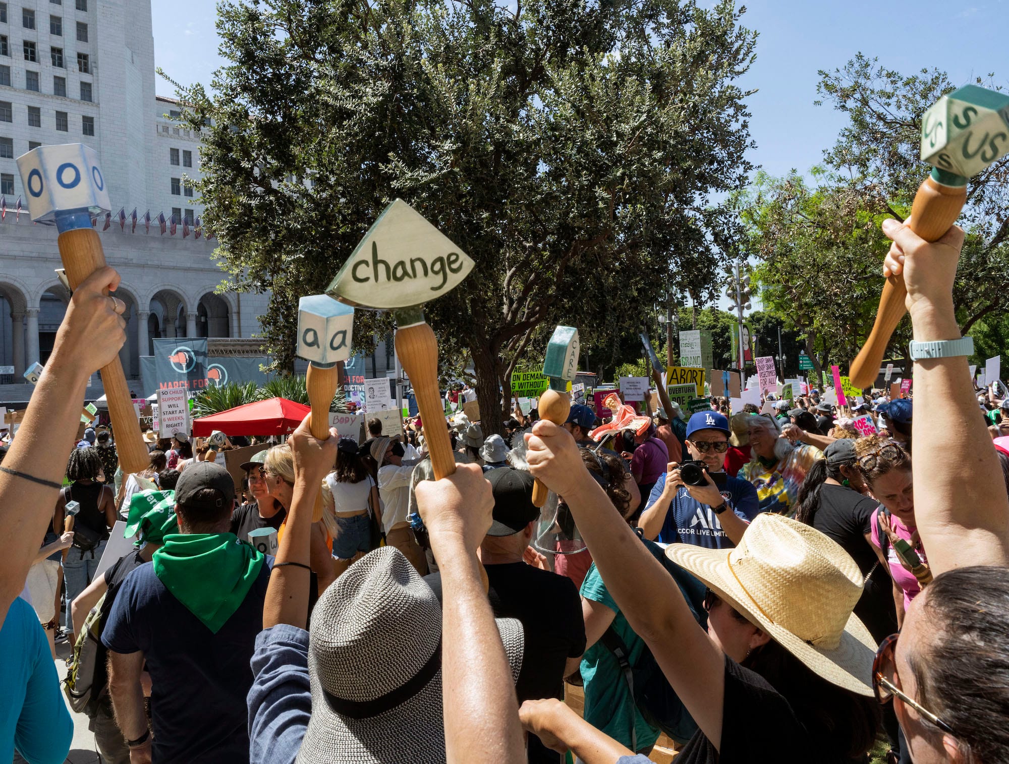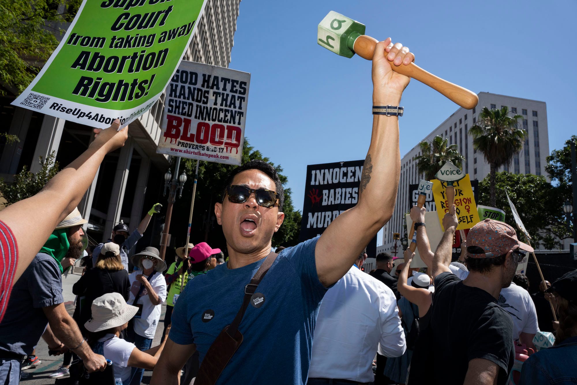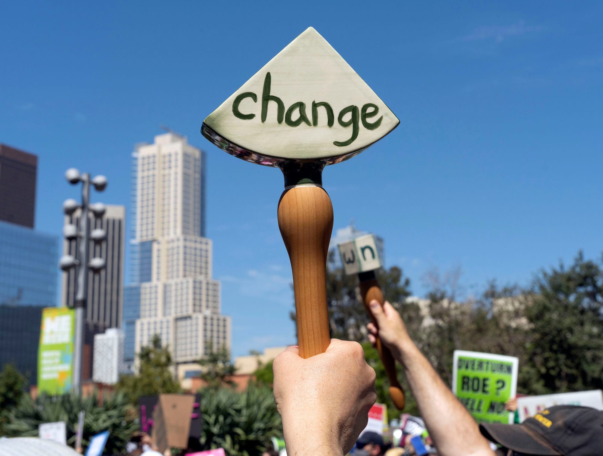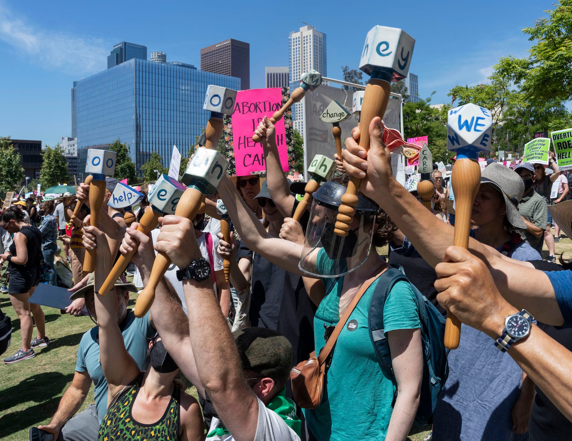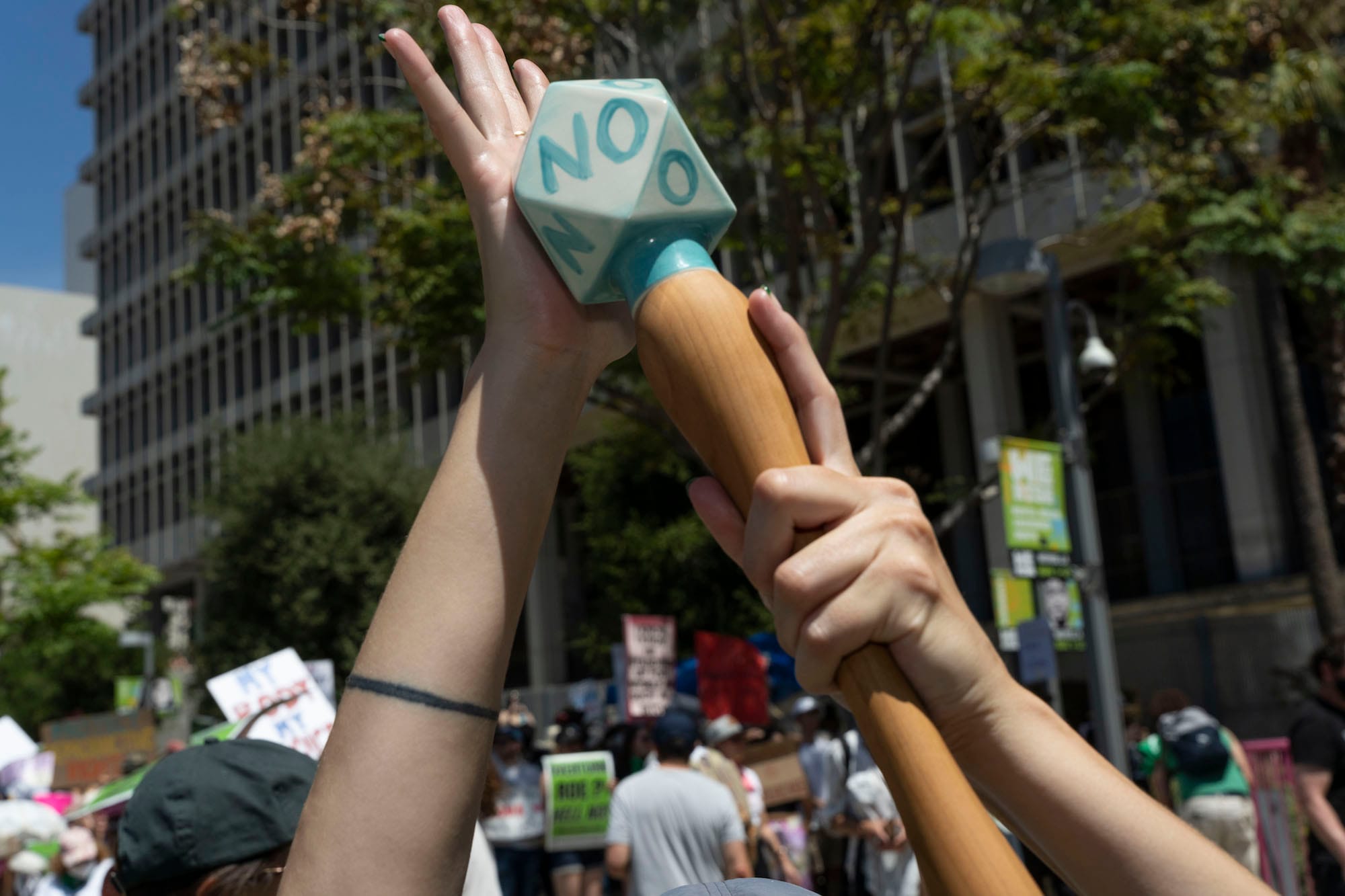 LOS ANGELES — On May 14, charged with fury over the leaked Supreme Court draft decision that would overturn Roe v. Wade — a forewarning that became a grim reality today, June 24 — thousands gathered in front of City Hall for the Bans Off Our Bodies rally. Among the protesters was Elana Mann, who angrily shook a ceramic rattle painted with the word “nooooo,” the extra vowels stretching out the internal scream that leapt from her heart.