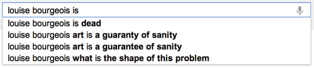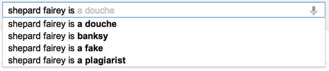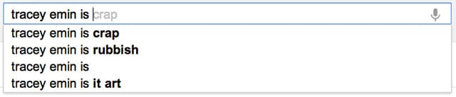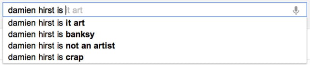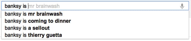 First, what I discovered in this absurd but surprisingly fun process. This “game” doesn’t work well with all artists (it works best with the really famous ones). Also, it doesn’t work for artists with common names (sorry, Fred Wilson). And finally, even for the more renowned artists it works best for contemporary artists, particularly those who foster controversy (Banksy, Tracey Emin, etc.).