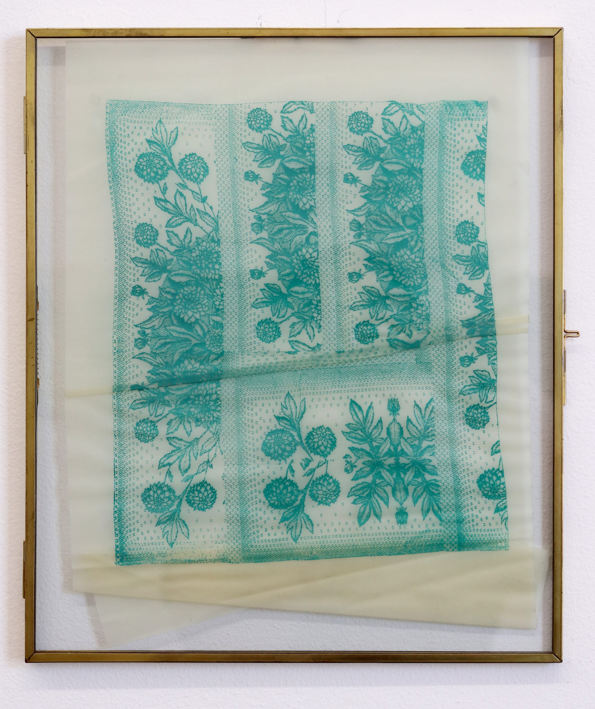 The exhibition’s atmosphere is at once jaunty and guarded, reflecting the tone of the title, which feels like both a riddle and a portent. Mindiashvili has a knack for creating installations that, through an economy of architectural means, strike a teasing balance between disclosure and concealment. What color’s resonant details reinforce this dynamic. Inside the steel box, for example, an iPad plays night vision film footage of a hedgehog nosing around a patch of grass. (One of the artist’s earliest childhood memories is of a hedgehog.) Two series of 13 by 11-inch framed oil on latex silkscreens, “(Patterns of My Consciousness)” and “Patterns of My Consciousness (where I used to nest)” (both 2021), hang, rebus-like, on the walls. The former depicts chalkboard grids containing the Georgian alphabet, each grid missing some letters, while the latter depicts crinkled and forlorn segments of the artist’s beloved childhood blanket.