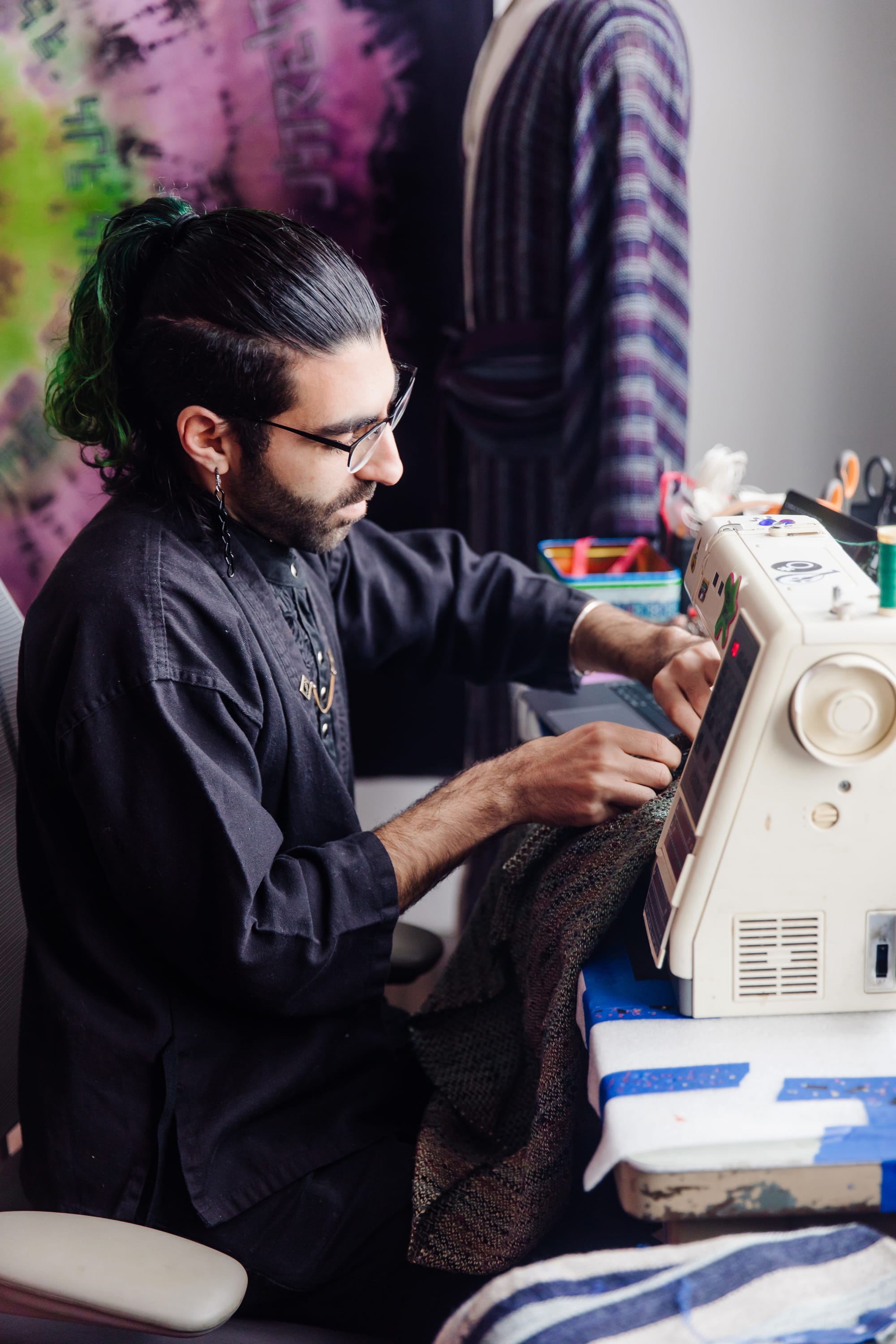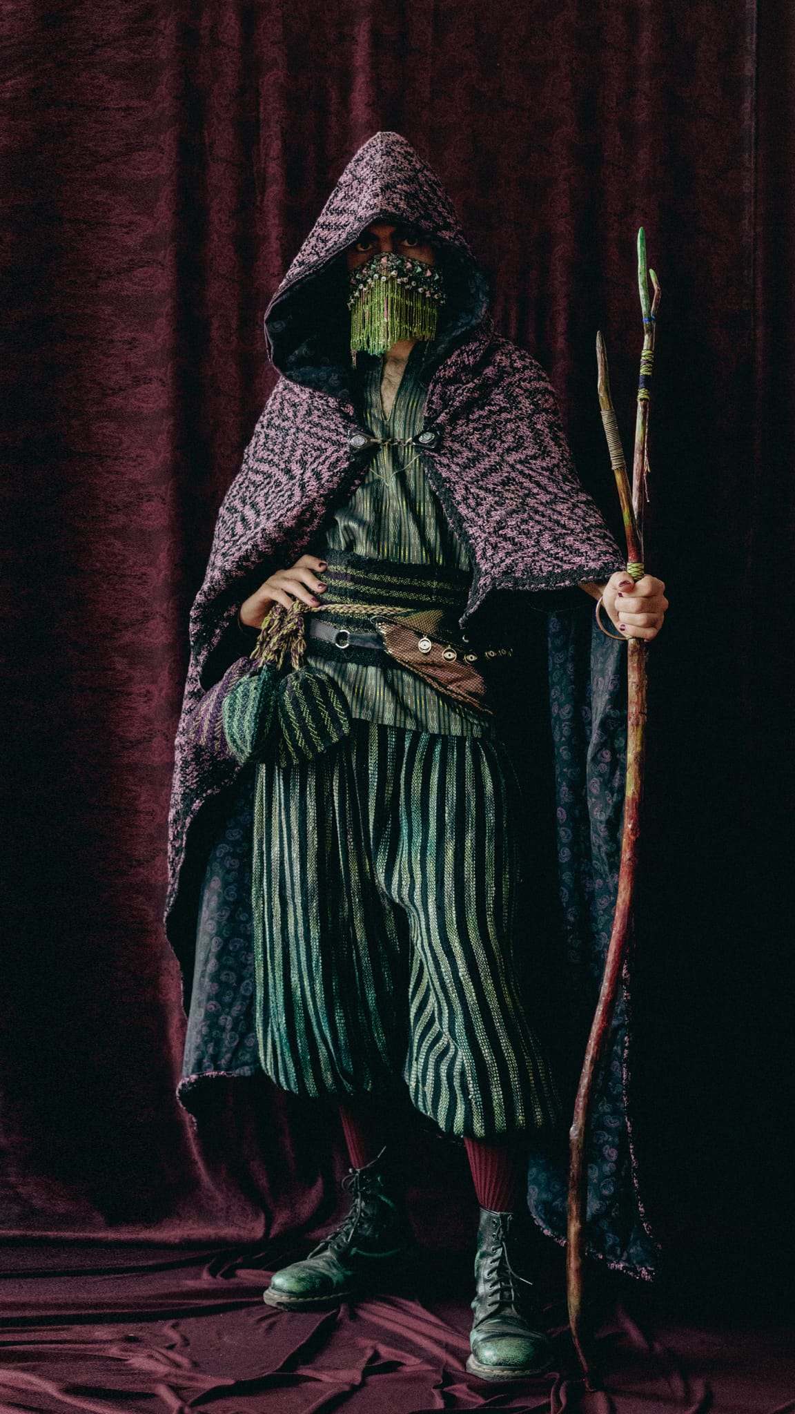 Levon Kafafian: Thread by thread, I am currently building a story world called Azadistan for an eventual graphic novel titled Portal Fire. This world emerges from the diasporic imaginary of Southwest Asia and is set in a distant future after a digital collapse. As of now, I'm focusing on its cosmology — the spirit beings who protect the people of the land and allow them to practice fire magic. To that end I dive into research on Armenian spiritual traditions, practices, and objects through time, blending this with my lived experiences and desires for the future. As I synthesize these into woven fabrics, costumes, and artifacts, I learn about the character of this world and the beings who inhabit it, generating the written lore and narrative that inform future works.