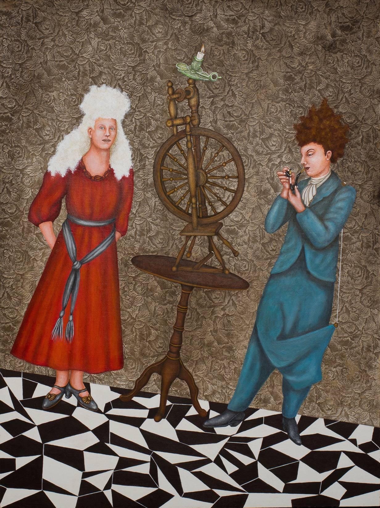 Her second exhibition at Culver City’s Walter Maciel Gallery, Gender Renaissance, features a diverse cast of multiracial characters, portrayed in traditional settings that are punctuated by surrealist interventions: a classical portrait of a man with mushrooms sprouting from his head, for example. These new works also explore issues of gender identity and fluidity, inspired by Saar’s son who has been transitioning from female to male over the past several years. In addition to these intimate paintings, the show also features large-scale fabric banners that prominently display portraits of women. Fusing the African-American quilting tradition with European tropes of portraiture, these works grant monumental status to those that have historically been underrepresented.