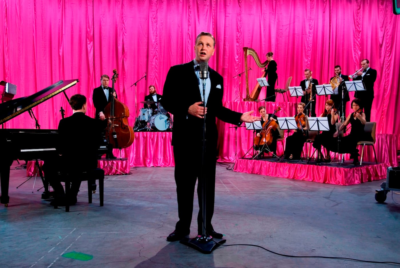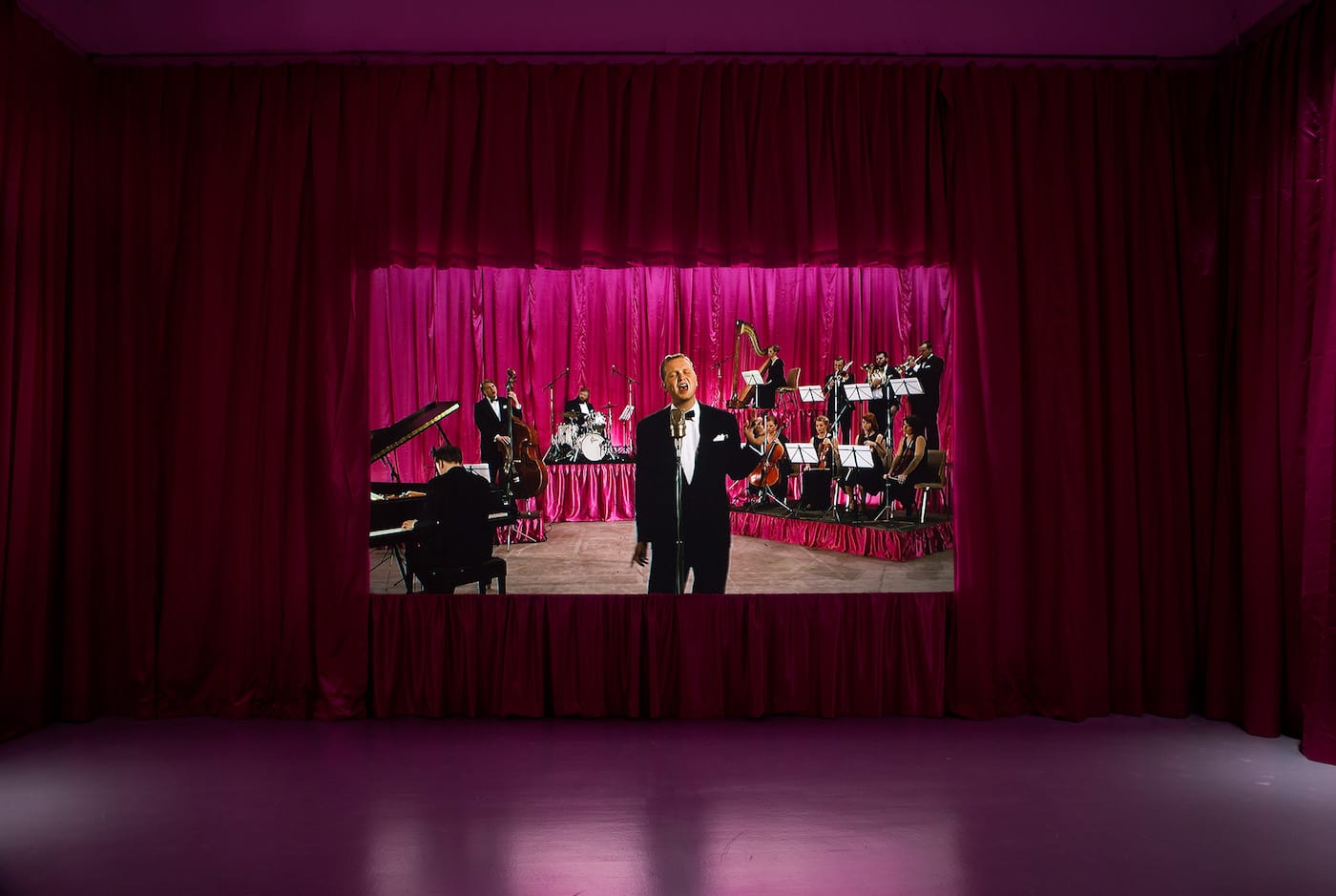 Anyone who experiences all thirty-plus minutes of “God” (2007), a video installation by the Icelandic artist Ragnar Kjartansson currently on view in the artist’s retrospective at the Hirshhorn in Washington, won’t soon forget its fundamental teaching, “Sorrow conquers happiness.” The piece’s only words, they are sung hundreds of times by Kjartansson, who plays frontman to a small jazz orchestra in a garishly retro make-believe ballroom. The artist’s repeated crooning of an eight-bar minor-key melody, which crests on a major chord before looping back to its beginning, remains modest in its expressive range. A half-hour-long vamp would seem to all but mandate some vocal gymnastics from the singer, but Kjartansson, whose boyish, unassuming presence and somewhat ungainly body suggest a studied amateurism, refuses to transform or even vary the simplicity of the phrase being sung.