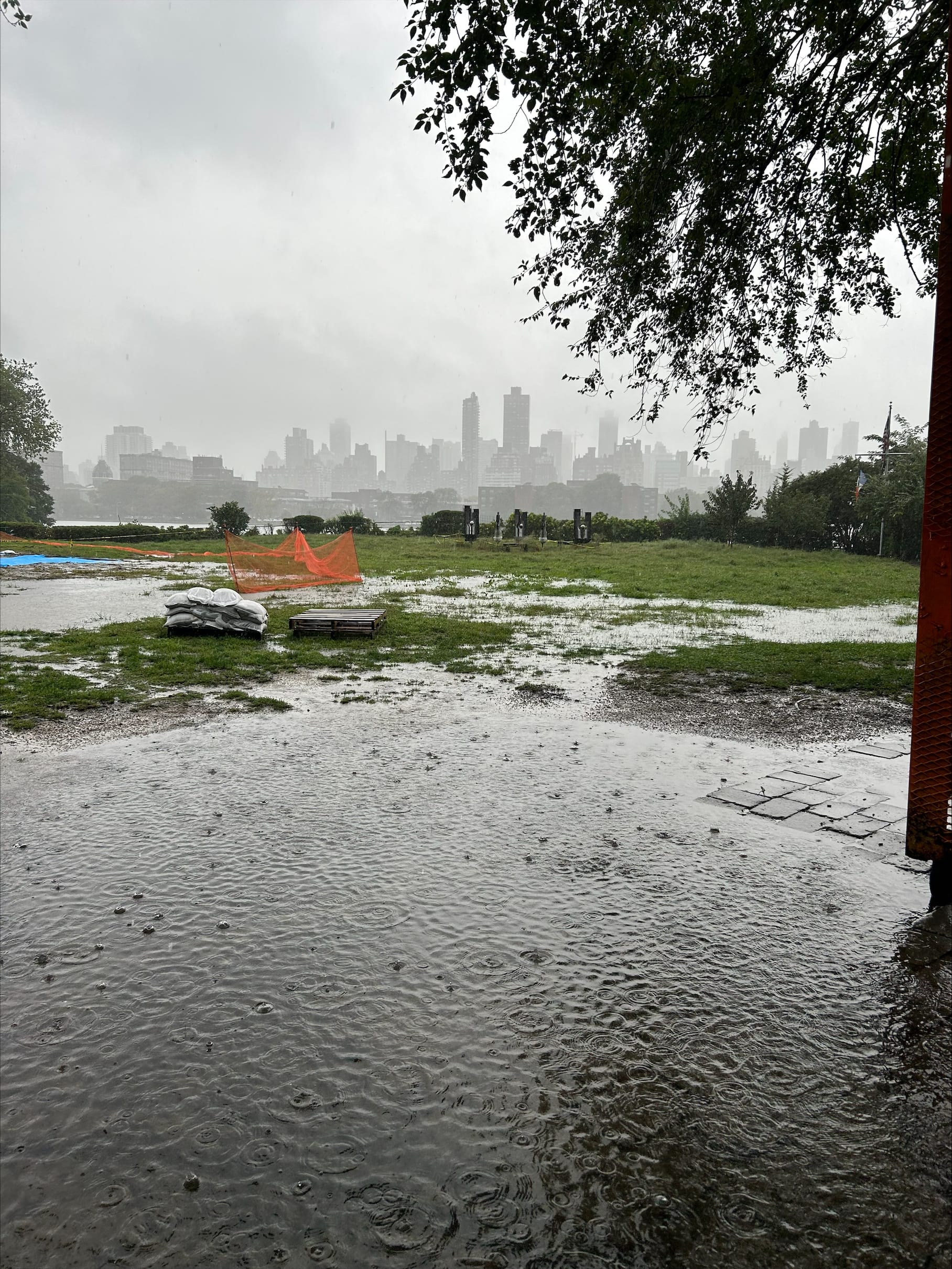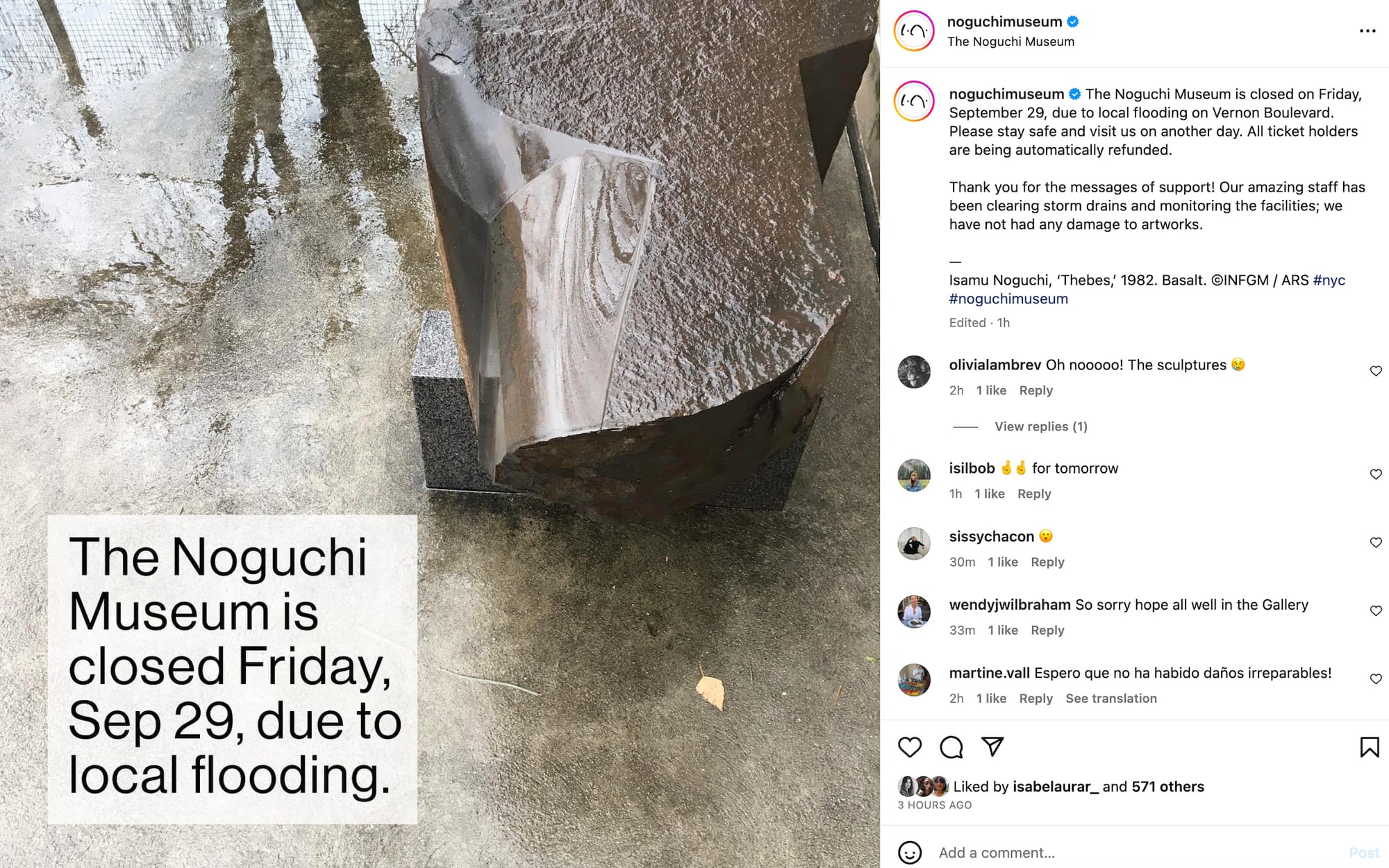 "It was pretty wild this morning, but our team worked on clearing a few blocked storm drains along our stretch of Vernon and thankfully the water has started to go down," Amelia Grohman of the Noguchi Museum told Hyperallergic. The institution experienced some mild flooding in its basement; however, staff reported "no damage to artworks."
