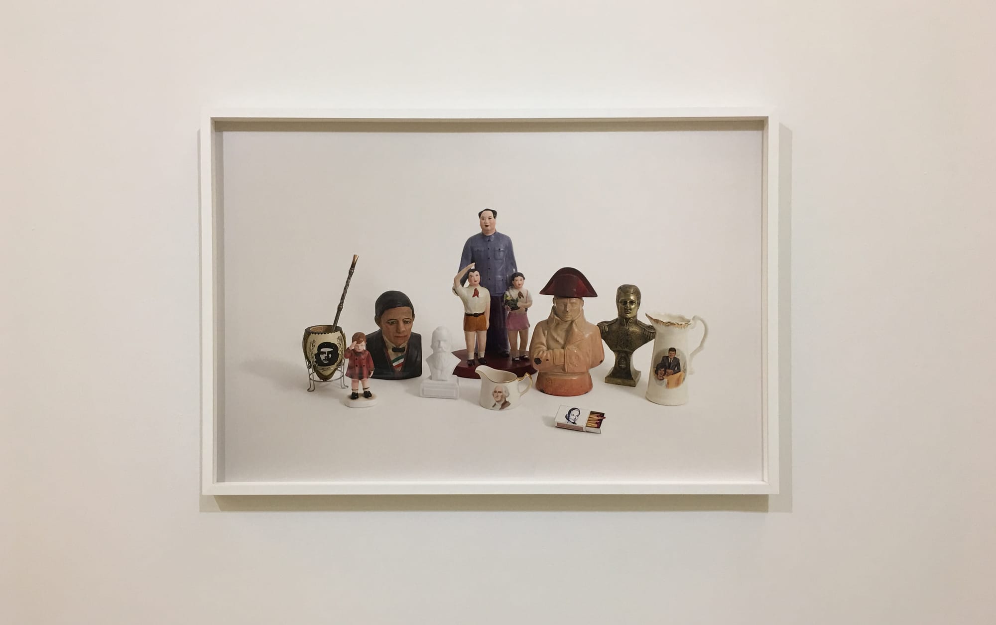Perhaps the funniest work in this show to touch on the ideas above, is a large-scale photograph titled simply “Memorabilia” (2016). Again, against a blank, edgeless backdrop, Porter has arranged a group of figurines, ceramic objects, and other cheaply manufactured items, each featuring the image of political figures ranging from China’s Mao Zedong to France’s Napoleon Bonaparte to the US’s George Washington and John F. Kennedy to Argentina’s Eva Perón. For some in the US, they might jar at seeing Washington or Kennedy next to Mao or Napoleon. But again, it’s a matter of framing, of the narrative you spin. And though largely silent, Porter’s work is very much about the stories you spin while looking at it.