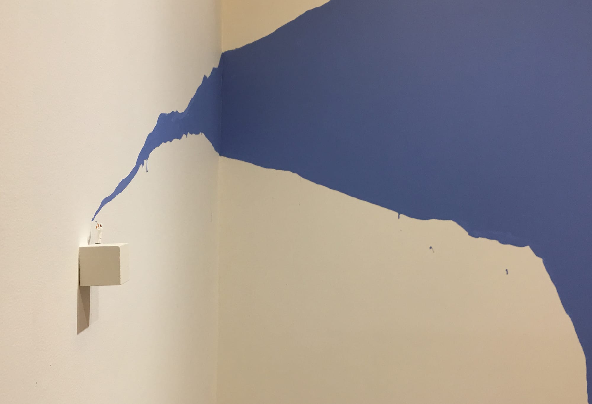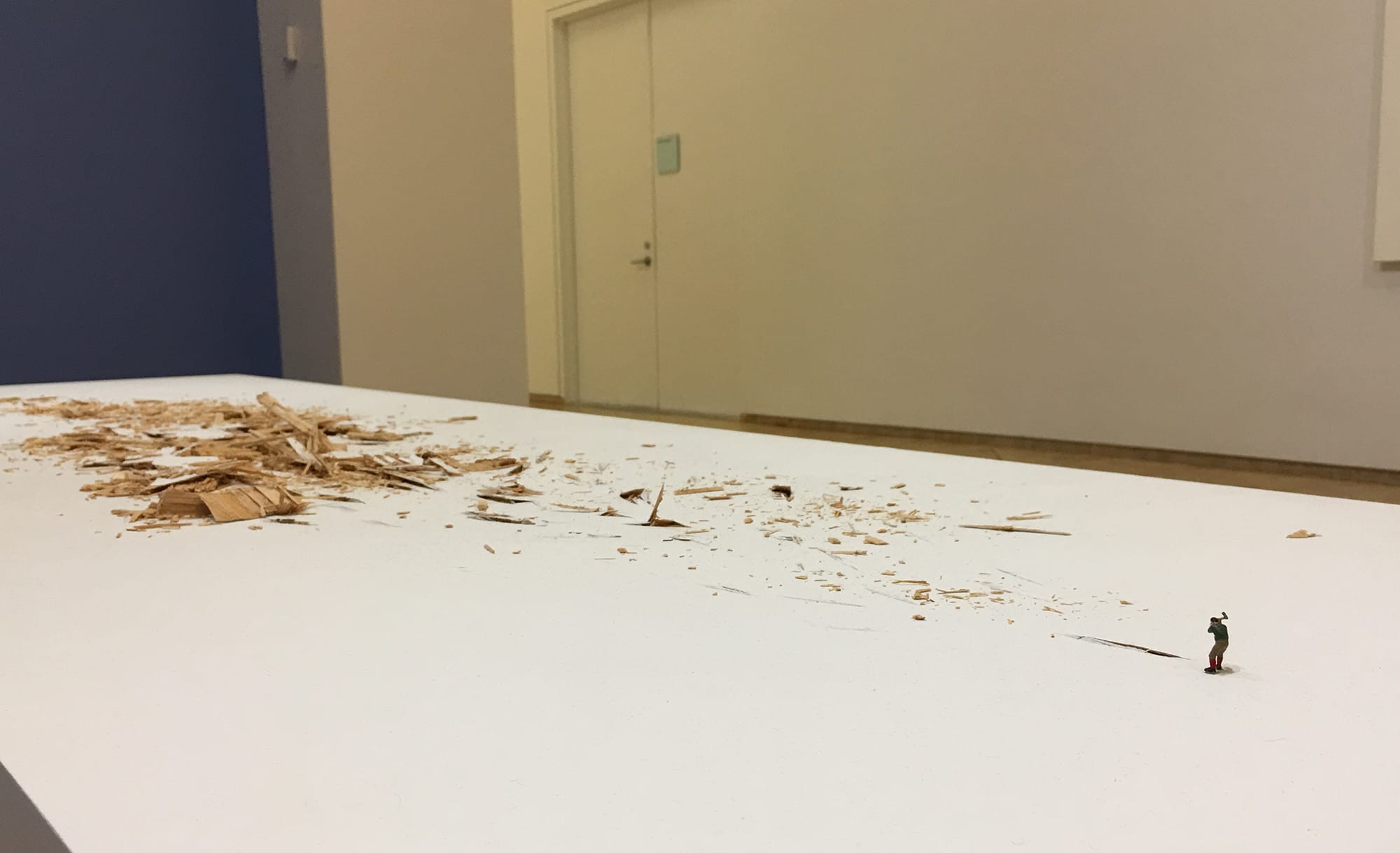 Another theme that appears frequently in the works on display is that of labor, of tiny workers bent steadily into tasks, the enormity of which simultaneously dwarfs and enlarges each laborer. If you were to stitch together all the clothing sewn by a garment worker, or to lay out all the walls that a house painter has ever painted, as these works seem to invite us to do, you might be struck by the endlessness of those tasks. The janitor who returns each night to make clean what will only be made dirty tomorrow; the homemaker who cooks one meal, only to do it again in a few hours. I couldn’t help but think of Hannah Arendt’s brilliant writing in her book The Human Condition while looking at these works: “It is indeed the mark of all laboring that it leaves nothing behind, that the result of its effort is almost as quickly consumed as the effort is spent. And yet this effort, despite its futility, is born of a great urgency and motivated by a more powerful drive than anything else, because life itself depends upon it.”