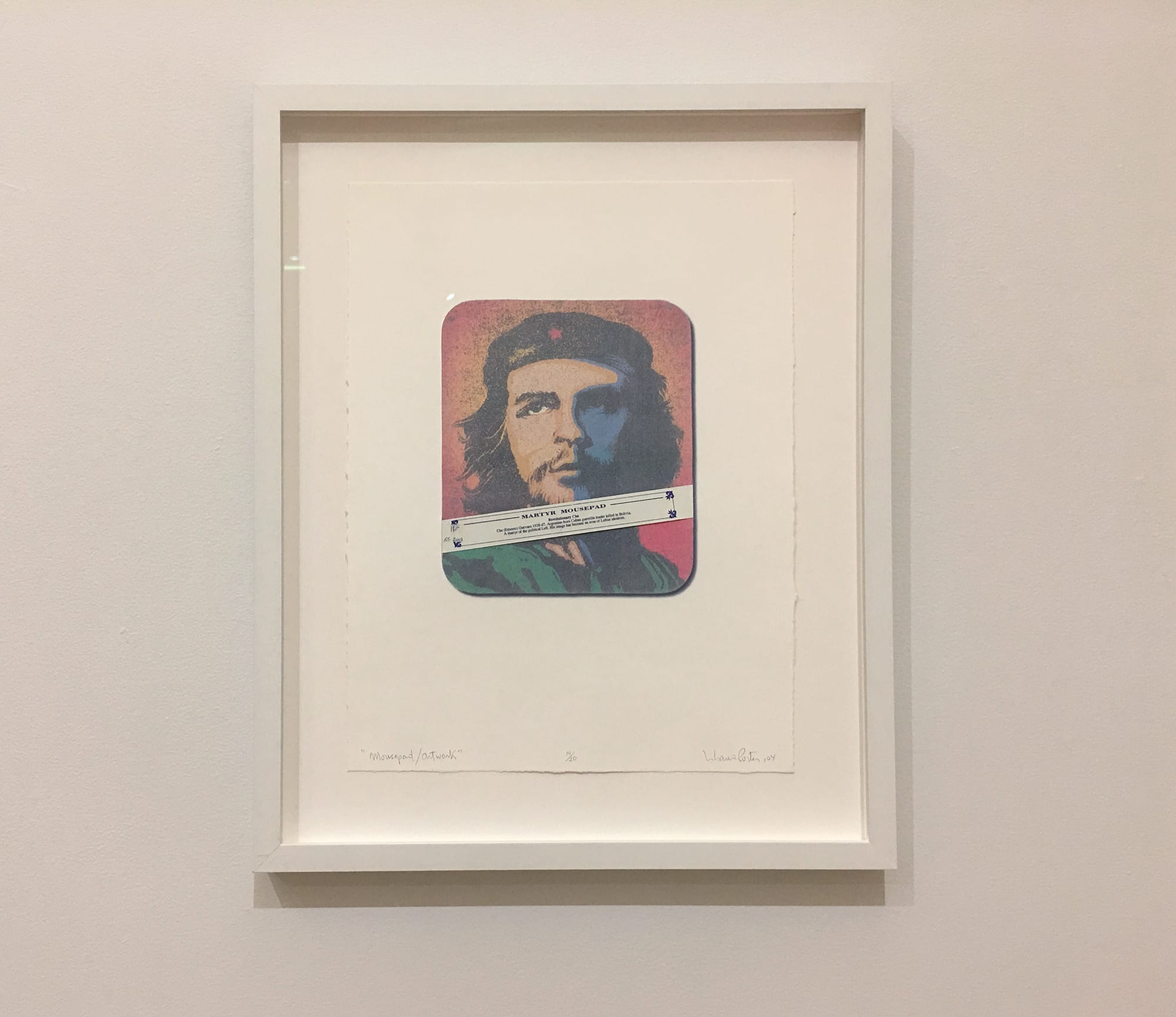 But it’s not just the cheese. Here, this work is laid out with two others in a triptych. Beside Joan of Arc sits Che Guevara, in this instance rendered by the manufacturer as a “Martyr Mousepad.” On the other side of Joan is a sugar Jesus wrapped in cellophane, paired with another Jesus flipped over to reveal the price and ingredients in this most unholy body of Christ.