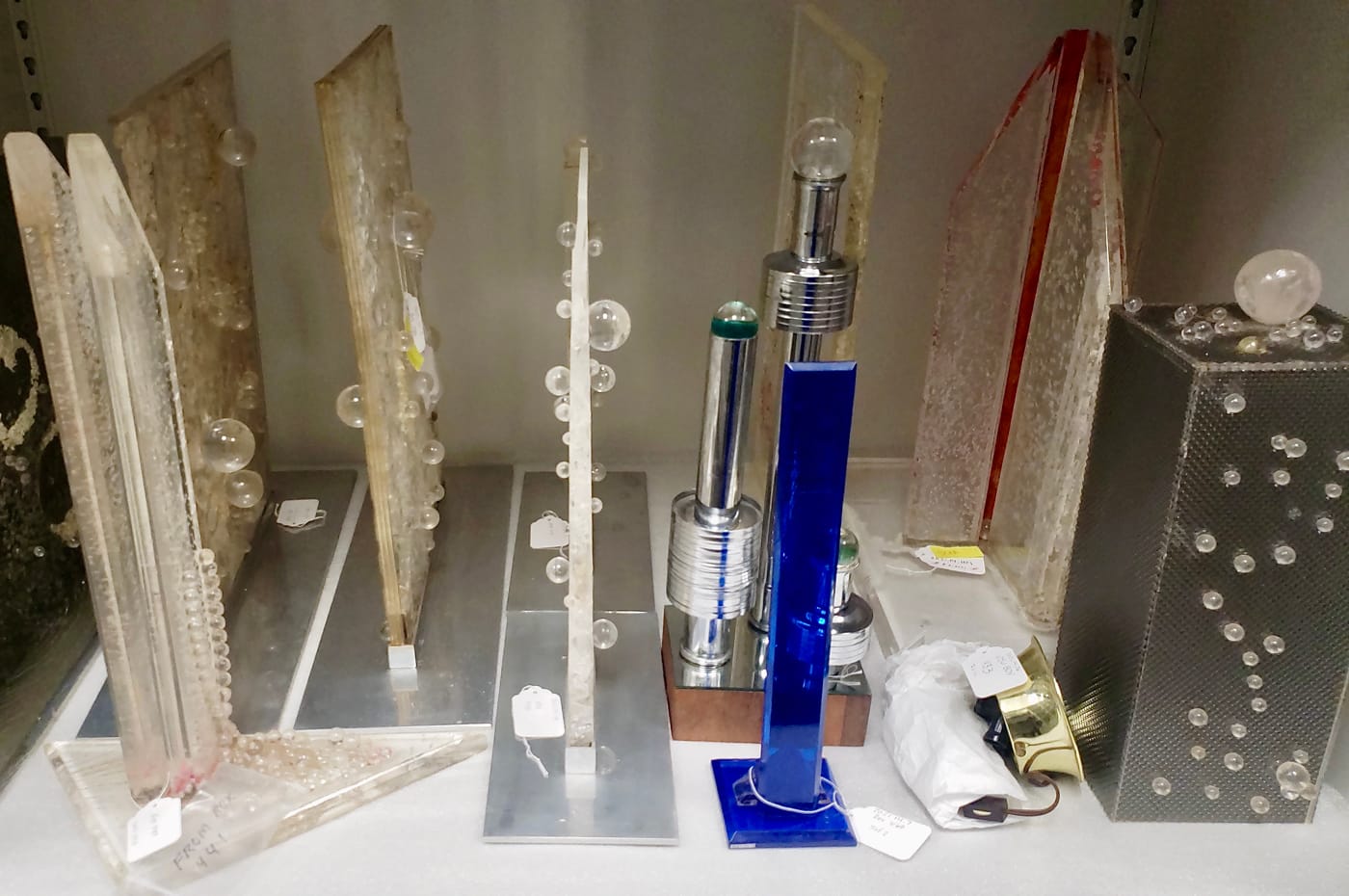 But Schwartz was already making her way as an artist before the crucial connection that led her to work at Bell Labs; in 1966, she had extended her material experiments to work with light boxes and mechanical devices like pumps. She became a member of the Experiments in Art and Technology (E.A.T.) group, which encouraged collaboration between artists and engineers, and in 1968 her kinetic sculpture, “Proxima Centauri,” was part of an influential show of machine art at the Museum of Modern Art, The Machine as Seen at the End of the Mechanical Age. This career-launching sculpture is just one of the objects acquired by the Henry Ford Museum; it utilizes a slide projector to throw a series of light displays into a white plastic orb, and was at one point used as a special effect for an original Star Trek episode, representing a prison for Spock's brain.