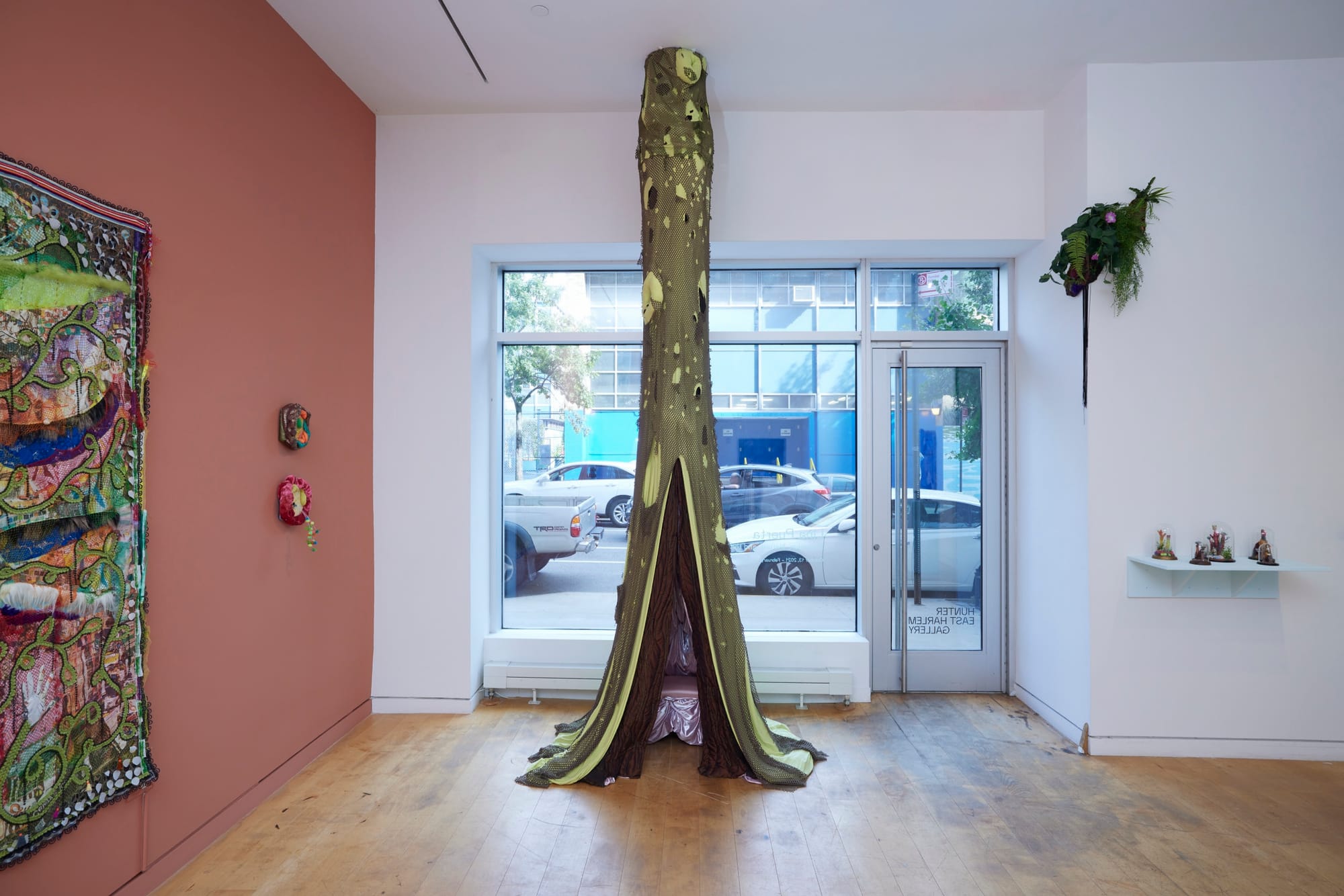 The lobby wall outside Hunter East Harlem Gallery teems with artworks that resemble irregularly shaped vertical gardens. The scruffy artificial greenery, from Lina Puerta’s Botánico series (2010 - present), spreads across nooks and crannies as if part of the building’s architecture and is festooned with incongruous decorations. Gold and silver jewelry chains dangle from fronds and grasses. Rhinestones, beads, and sequined fabrics sparkle on the ground beneath the imitation plant leaves. Long threads of decorative fringe hang from the verdant arrangements like hair extensions. These festive, costume-y details celebrate the artifice of botanical sculptures that appear actual from a distance but, on closer inspection, are unabashedly ersatz.