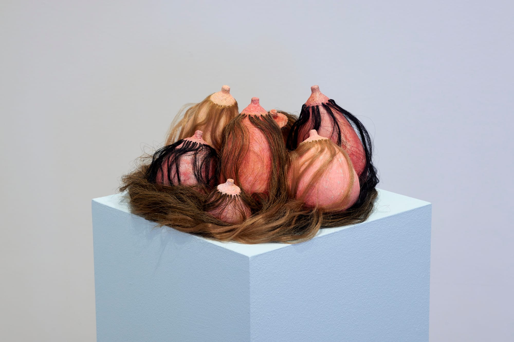The Botánicos serve as a fitting entry to Puerta’s under-the-radar survey, Migration, Nature, and the Feminine. Curated by Klaudia Ofwona Draber, with Sofia Ramirez as associate curator, the delightful mid-career exhibition showcases the artist’s impish, motley range. Several works pretend to be dilapidated paintings whose frayed supports have been overtaken by nature, as in the tree roots that have merged with a broken picture frame in “Untitled (Tree and Frame)” (2014). Others playfully mimic intimate female anatomical forms, such as the comical grouping of clay sculptures in the shape of breasts, with synthetic hair hanging from their nipples, “Sisterhood” (2003). Still others are less dimensional but no less colorful or materially various, as in a series of handmade paper tapestries, bedecked with sequins, lace, and food packaging, that depict portraits of Latino farmworkers.