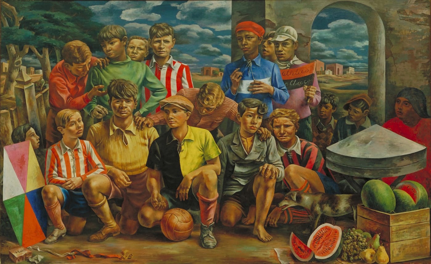 The works gathered here are the aesthetic highlight of the show, starting off with the smashing “New Chicago Athletic Club (Club atlético Nueva Chicago)” (1937) by the Argentine artist Antonio Berni, a large group portrait of more than a dozen characters, rendered in sparkling magic realism that strikes just the right note between monumentality and anecdote, with a clarity of perception that carries all the way through to the cluster of houses on the horizon and the weighty clouds hanging above them.