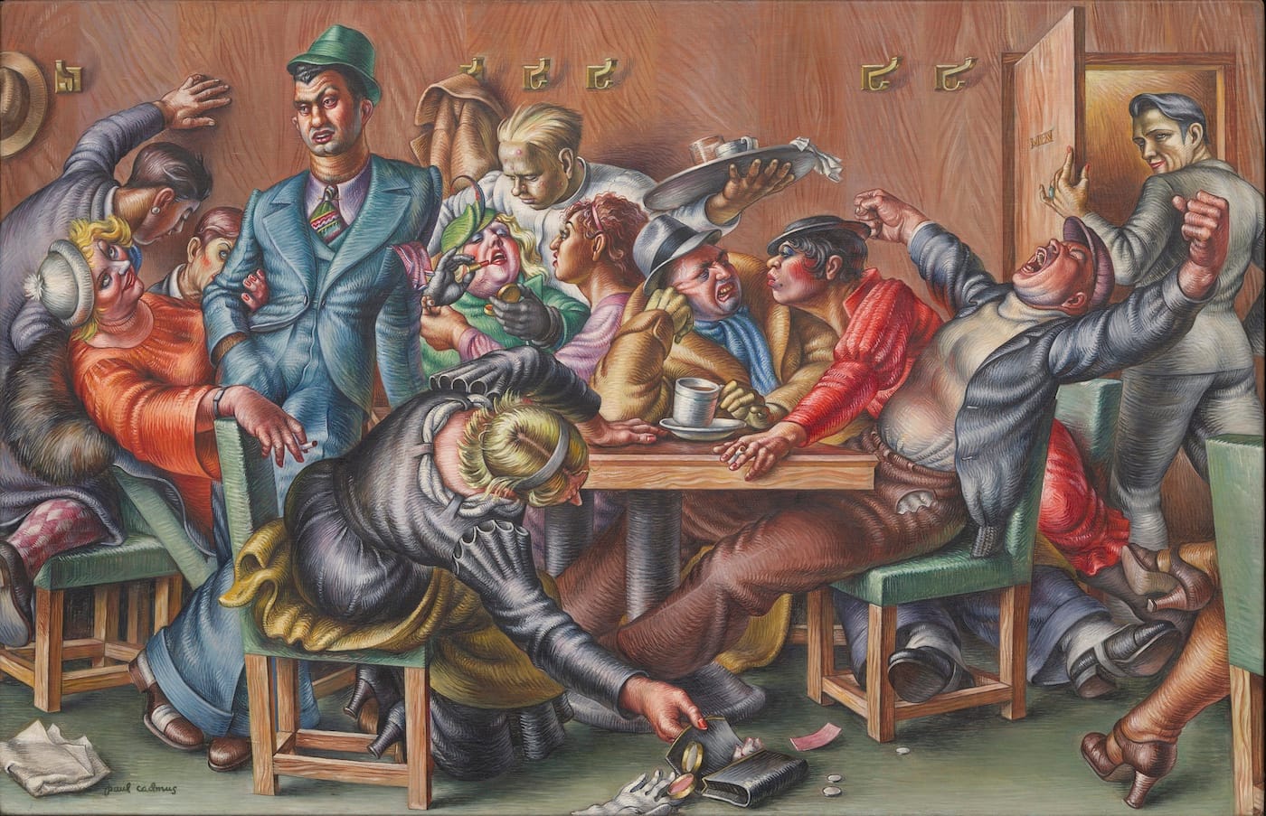 The wall label for “Greenwich Village Cafeteria” states that, since 1934, the painting has been on extended loan to the museum from the Fine Arts Collection of the United States WPA Art Program, which means that Cadmus’s dim view of his fellow citizens, one that figuratively opens a door to the artist’s sexual demimonde, was funded by taxpayer dollars. This inconspicuous ownership line underscores the immeasurable importance of the Public Works of Art Project (1933–34) and the WPA (Works Progress Administration) Federal Art Project (1935–1943), two Depression-era programs based on the radical proposition that artists should be able to make a living making art.