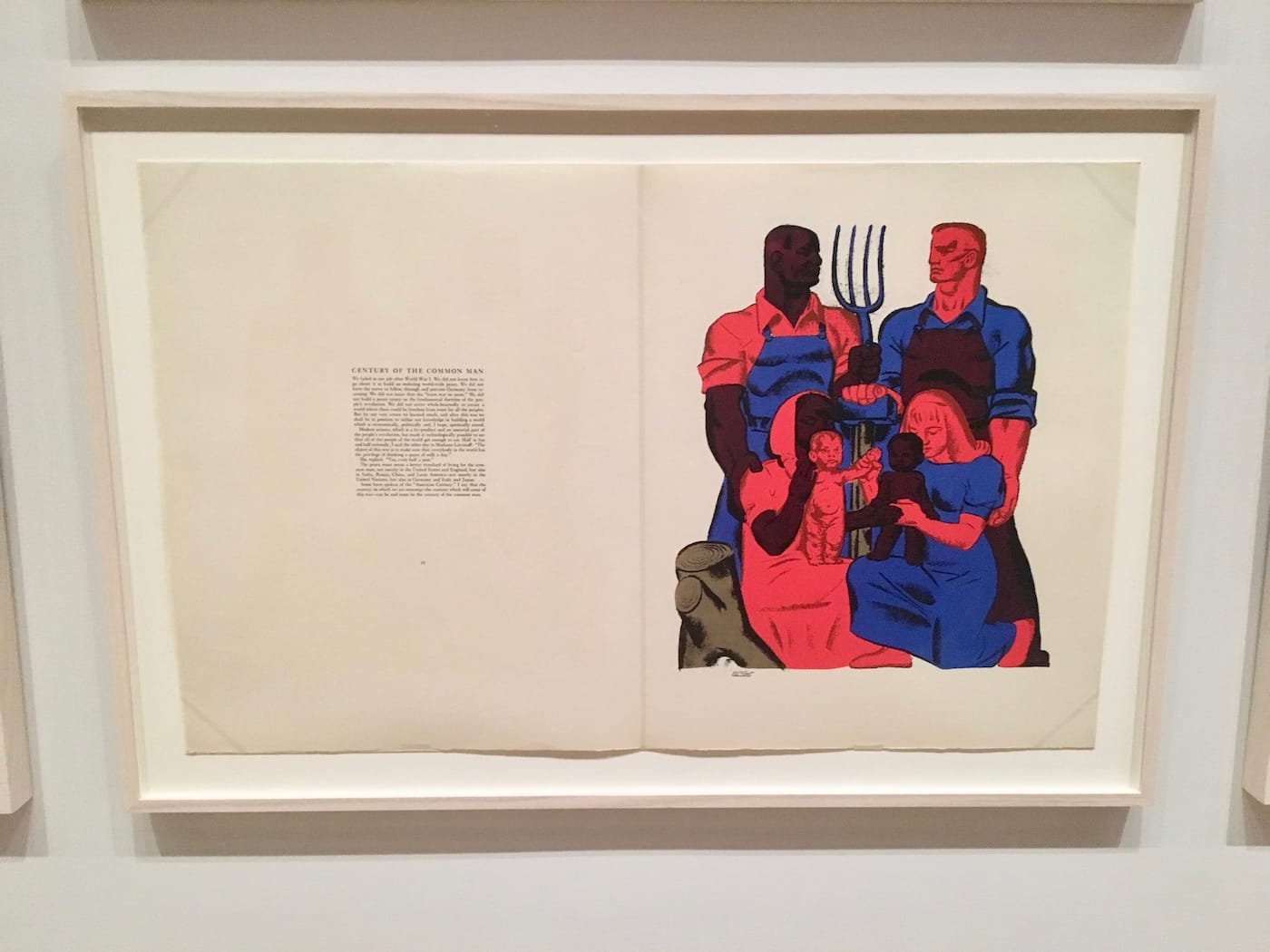 And, tellingly, much of their political relevance: one of the most moving images in the show, despite its naiveté (or perhaps because of it), is an illustration from Century of the Common Man in which two families, one black and one white, create a symmetrical composition dominated by red, brown, and blue. The two men face each other, the African American gripping a pitchfork and his white counterpart holding a sledgehammer; their wives crouch below, each dandling a baby on her lap in a 20th-century version of the Holy Family. But the babies belong to the opposite couple — the white baby stands on the black mother’s lap, while the black baby is held by the white woman. It’s a simple exchange with resounding significance.
