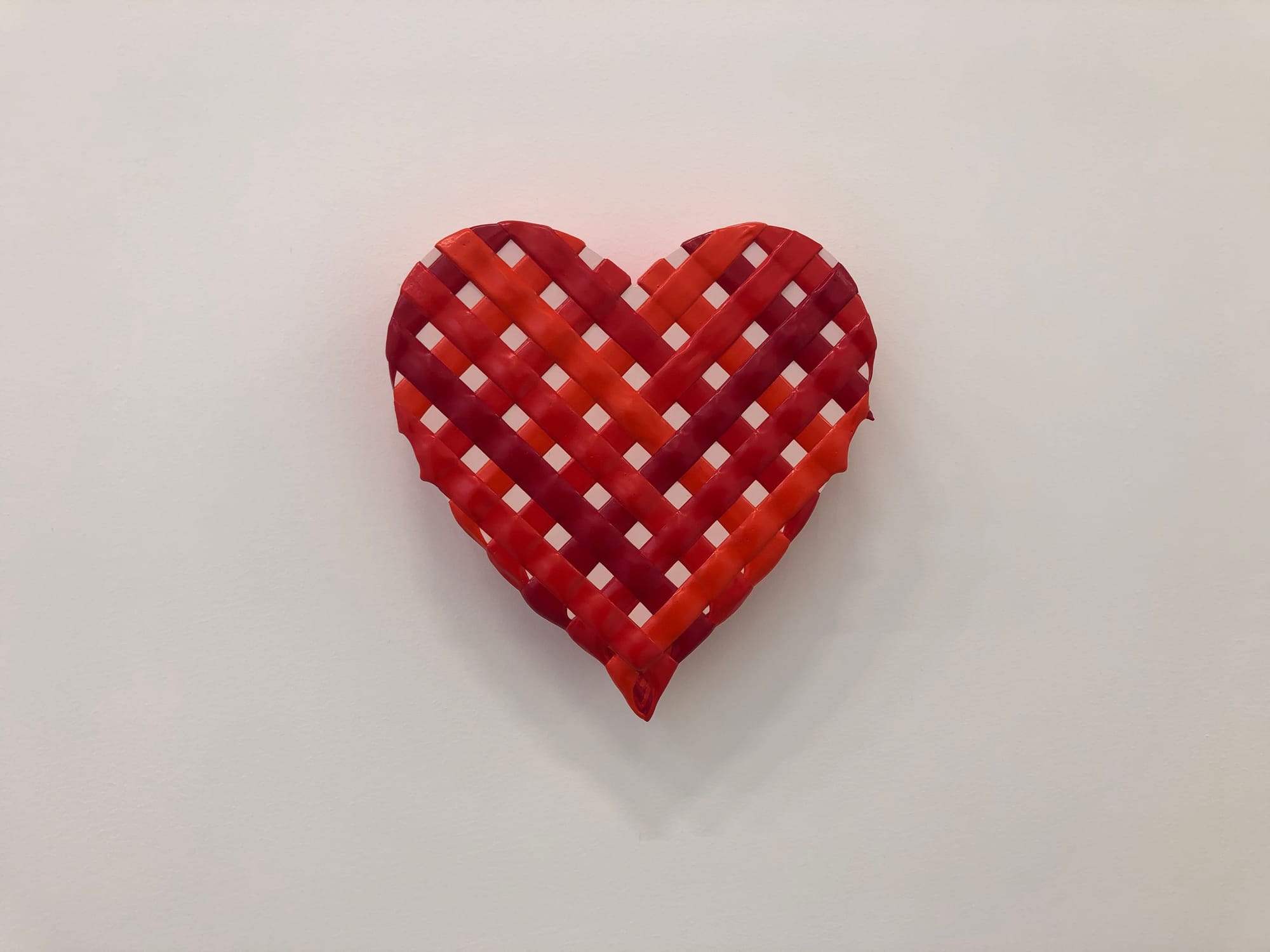 LOS ANGELES — Artist Linda Stark’s aptly titled Hearts provides a luscious, if somewhat repetitive, inaugural exhibition for David Kordansky Gallery’s newly expanded Mid-City space. As the title suggests, Stark’s paintings celebrate the heart ideogram in a multitude of ways. Especially striking are two sculptural pieces cut into actual heart shapes, “Perylene Heart Weave” and “Valentine” (both 2020). Painted in a way that culls to mind images of a besotted lover painstakingly icing a cake for the object of their affection, the paintings are tipped-off, so to speak, with braided pieces of paint at their ends, creating blink-and-you’ll-miss-it clitoral shapes carefully crafted into the work.
