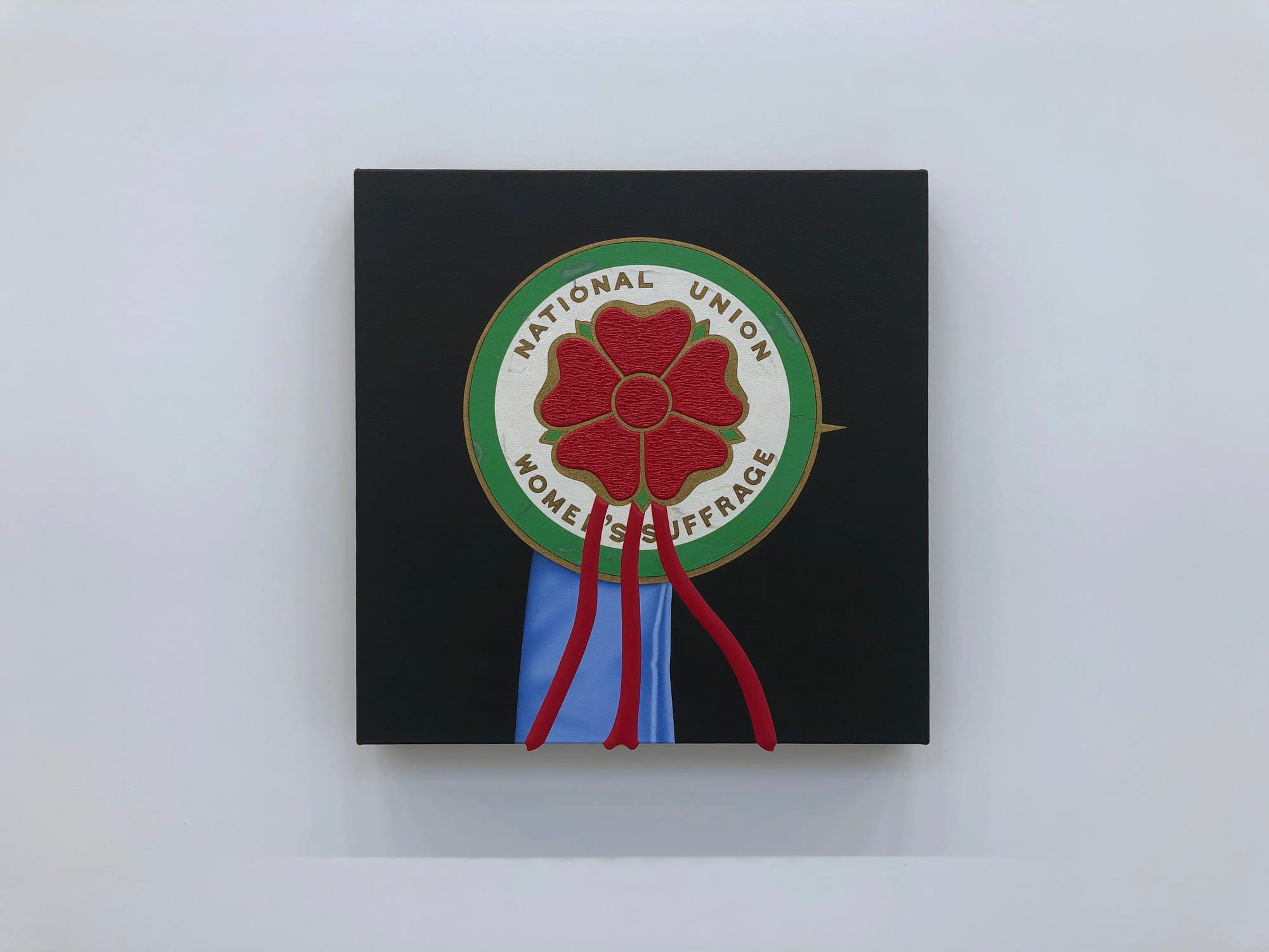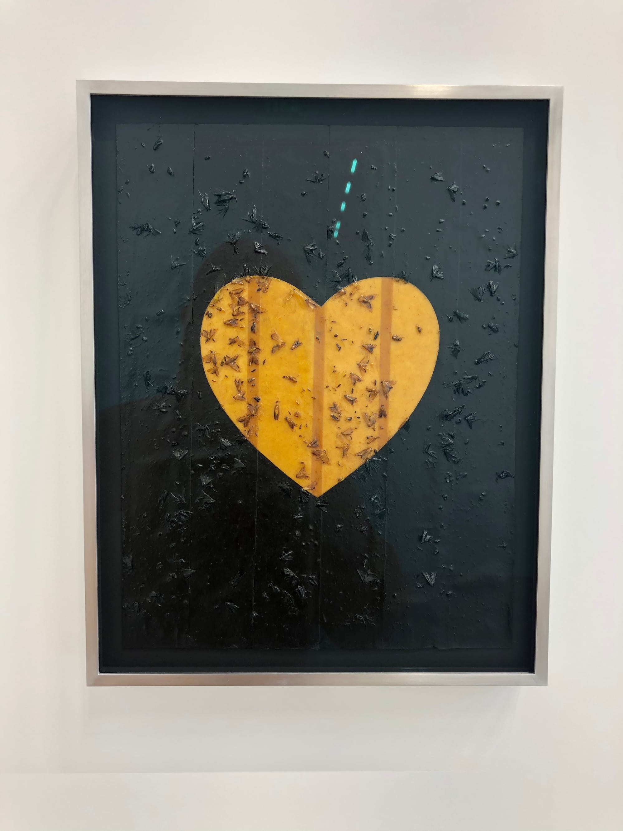 Some paintings are directly political, such as “Suffragette” (2019), in which Stark paints the crest of the National Union of Women’s Suffrage Societies, while others adopt more mutable, open-ended meaning, like “Fly Paper Heart” (2014), which sees Stark coating a layer of oil paint atop flypaper, marked with actual flies in the shape of — you guessed it — a heart.
