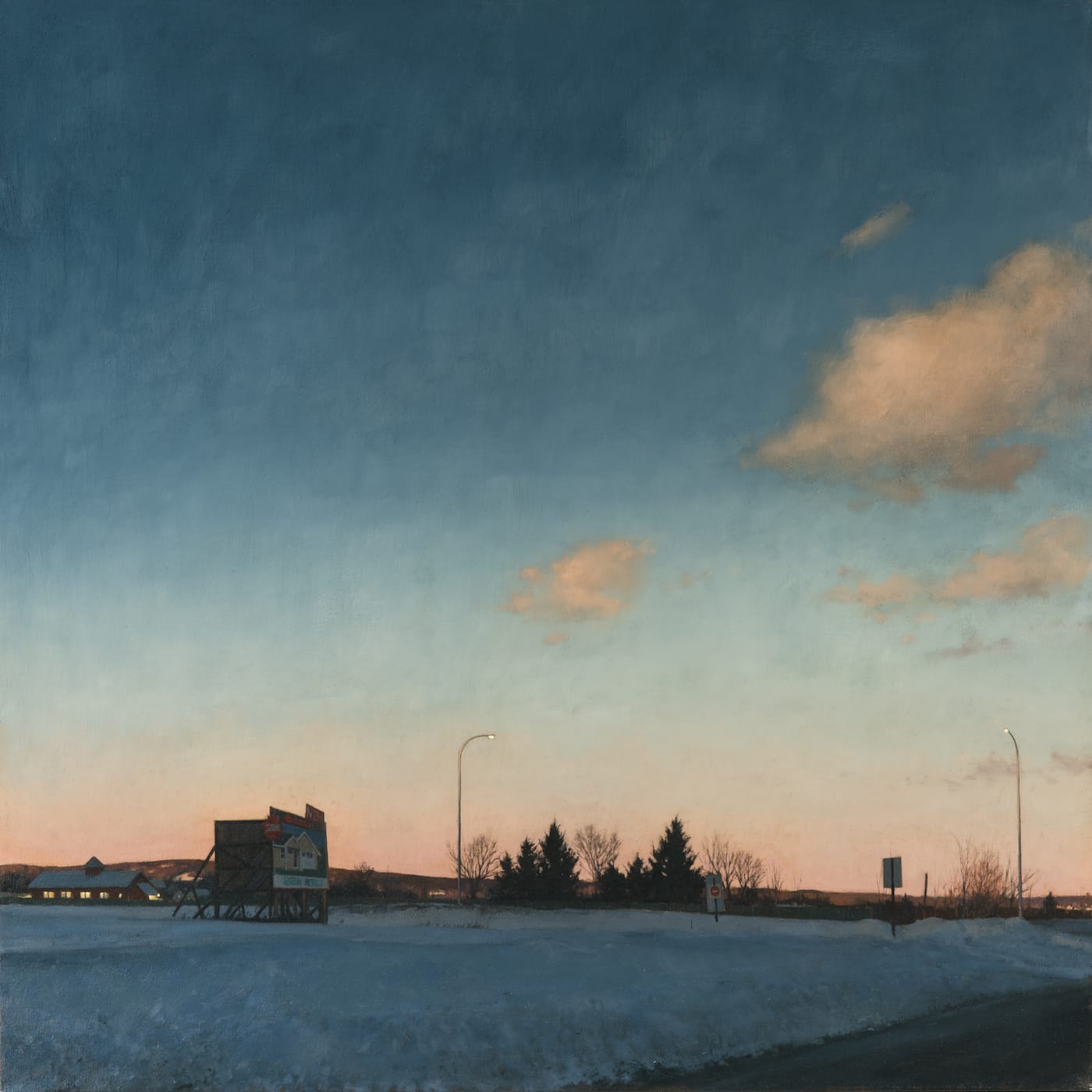 The light in Frederick’s paintings is remarkable. He can make the horizon glow without providing any warmth, as in “Offramp,” or recreate the weak radiance of an entrance light, as in “Rear Window.” He is a latter-day luminist, but one who prefers the chilled illumination of a moonless winter evening to a glorious sunset. The lighting is perfect for his theater of destitution.