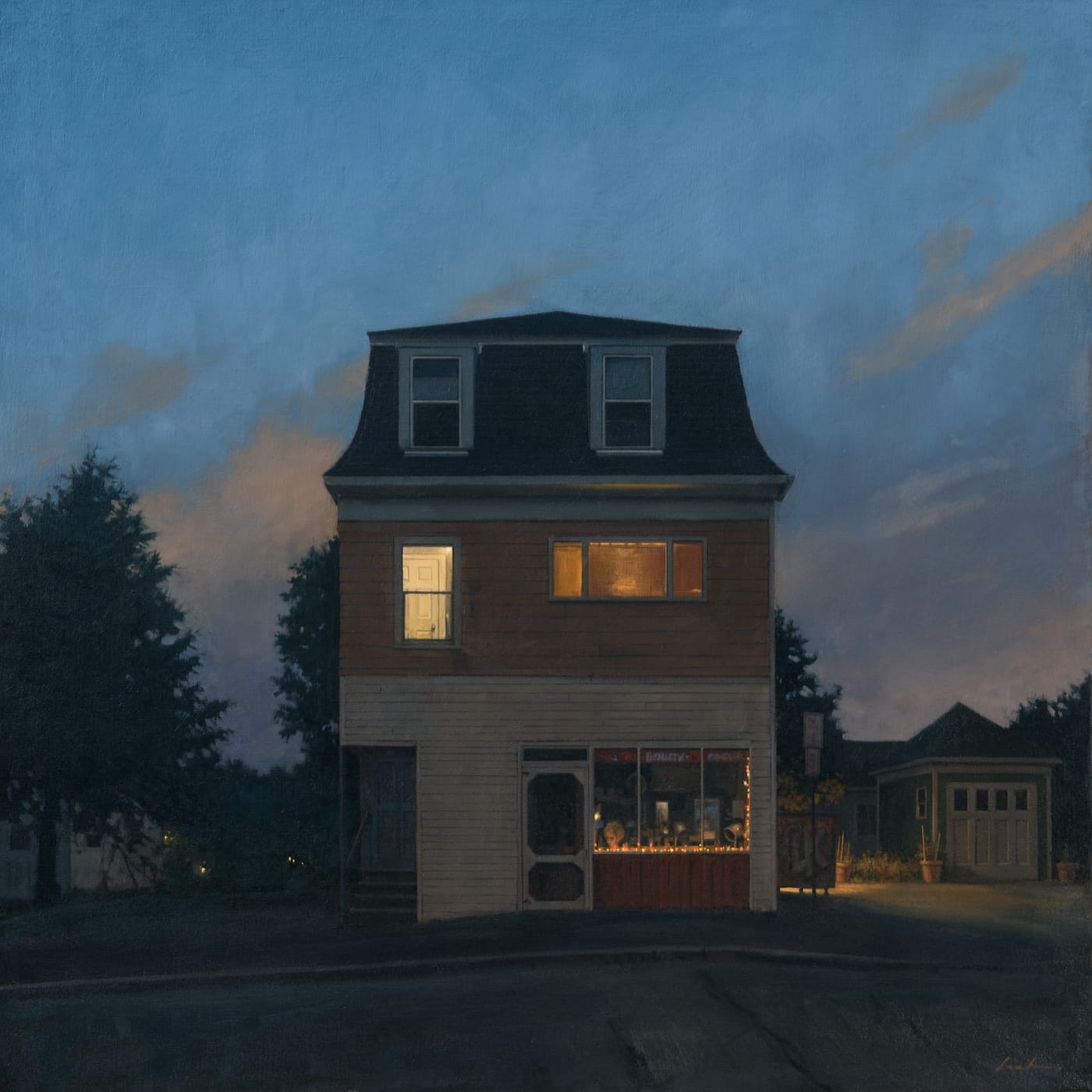 The fifteen realist paintings in Linden Frederick: Night Stories take us on a tour of small-town Maine.