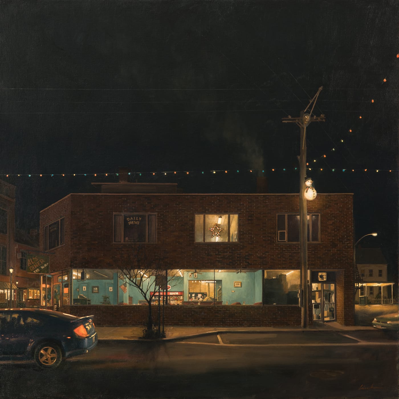 He loves the strands of Christmas lights left up long after New Year, like cheap finery on the facades of humble abodes. In “Takeout,” generic Christmas decorations add sad cheer to a two-story building that houses the Daily News office and an empty fast food joint, the latter conjuring both Hemingway’s “clean, well-lighted place” and Hopper’s “Nighthawks.”