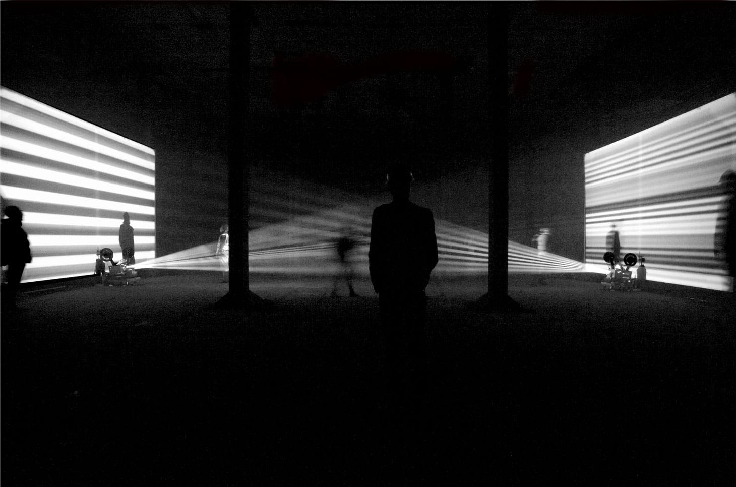 Since the 1970s, Rhodes has repeatedly called the public’s attention to women’s disempowerment. Her early feminist phase is represented by works such as the black and white Light Music (1975-76), inspired by gender imparity in music composing. The work plays in Nottingham in its original form — a two-channel 16mm projection, in which the beams of light from the projectors intersect and play off of each other. The installation is also partly immersive, since visitors can move through the stream of lights, becoming part of the configuration. The work arose directly from Rhodes’s experiments with creating simultaneous 16mm sound and image (commonly recorded separately). In this case, with a rostrum camera, Rhodes filmed a series of drawings, which she then printed onto the optical soundtrack of the film. What we see is then the visual manifestation of the soundtrack: rectangular black-and-white bands move vertically across the screens, widening and narrowing — an optical dance that amazes with its inventiveness and forceful aural cacophony.