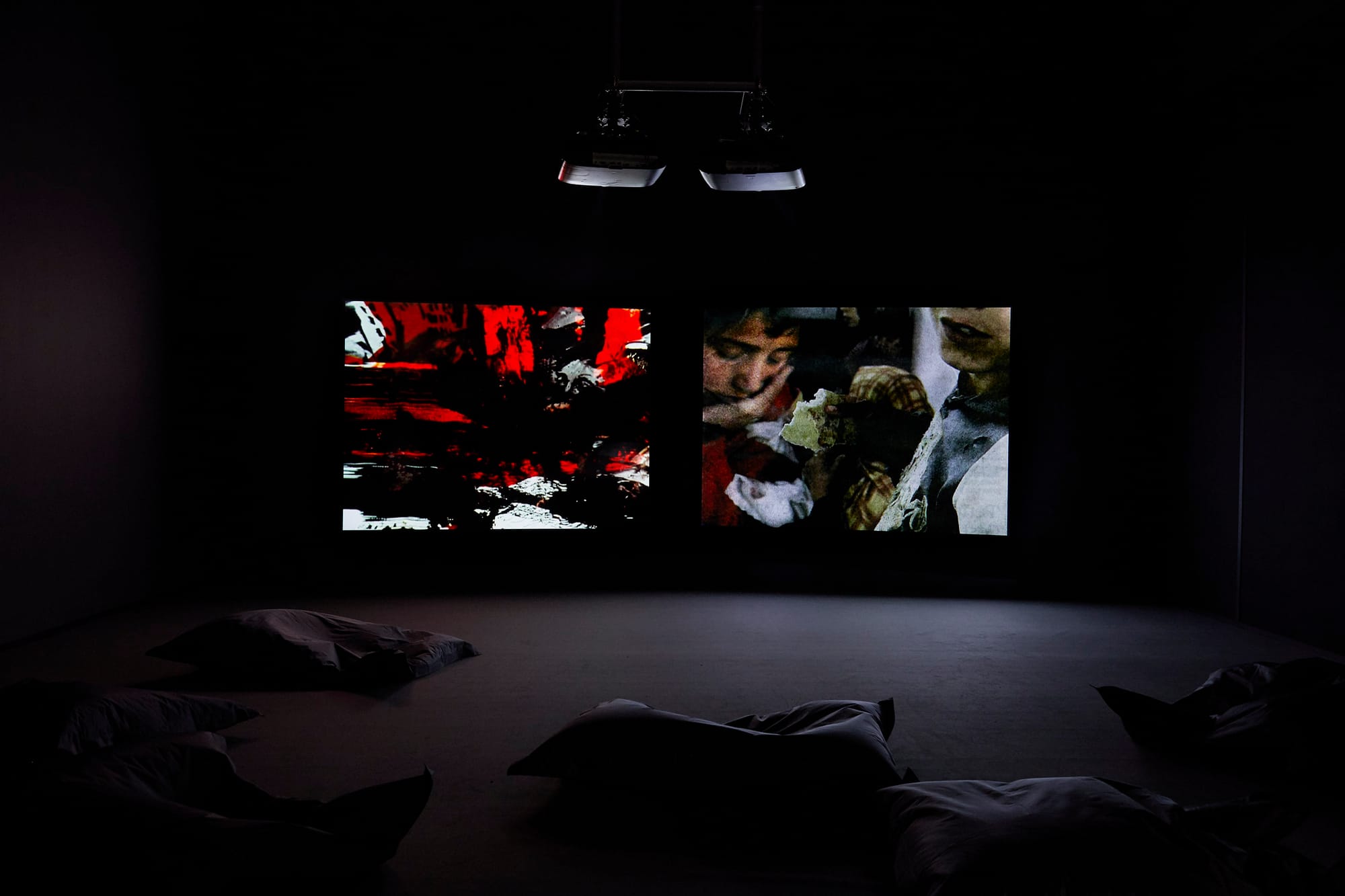 Rhodes’s lasting concern to use film as a tool for contemplation — and as an active outcry — against exploitation returns in her more recent two-channel installation, Dissonance and Disturbance (2012), a mix of her three previous films, in which she attacks the British economics from the 1980s, which she calls “taxing for living,” while also showing student protests against cuts in education and the economic devastation resulting from the Palestinian occupation. In yet another work, Ambiguous Journeys (2019), a 40-minute single-channel video, Rhodes links her investigation into how the British underground economy profits from exploiting migrants, to slave labor in Myanmar. In all of these, she often speaks directly in the voiceover, to dissect stories in which poverty generates cheap, vulnerable workforce.