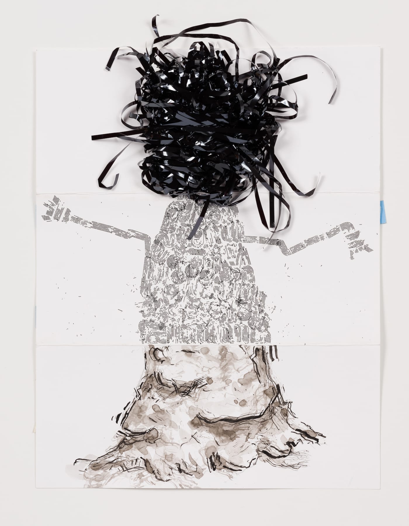 A quick glance at a few of the contributors highlights Bowman’s idiosyncratic and heterogeneous approach: South Bronx sculptor John Ahearn, along with his wife and son; artist Kenny Scharf; LA author and artist John Tottenham; Pat Place of post-punk band the Bush Tetras; artist Robin Winters, who recruited his students at SVA; ceramicist Jennie Jieun Lee; and Tom Recchion of the LA Free Music Society. Actress and director Jodie Foster contributed a tangle of audio tape, which sits above drawings by Michael Ballou and Daniel Healey. She told Bowman that it was a recording of her wife’s secrets.
