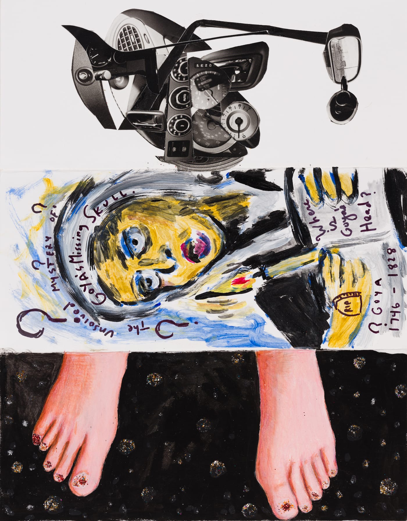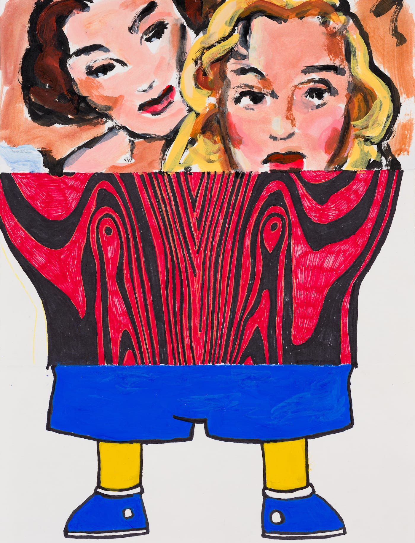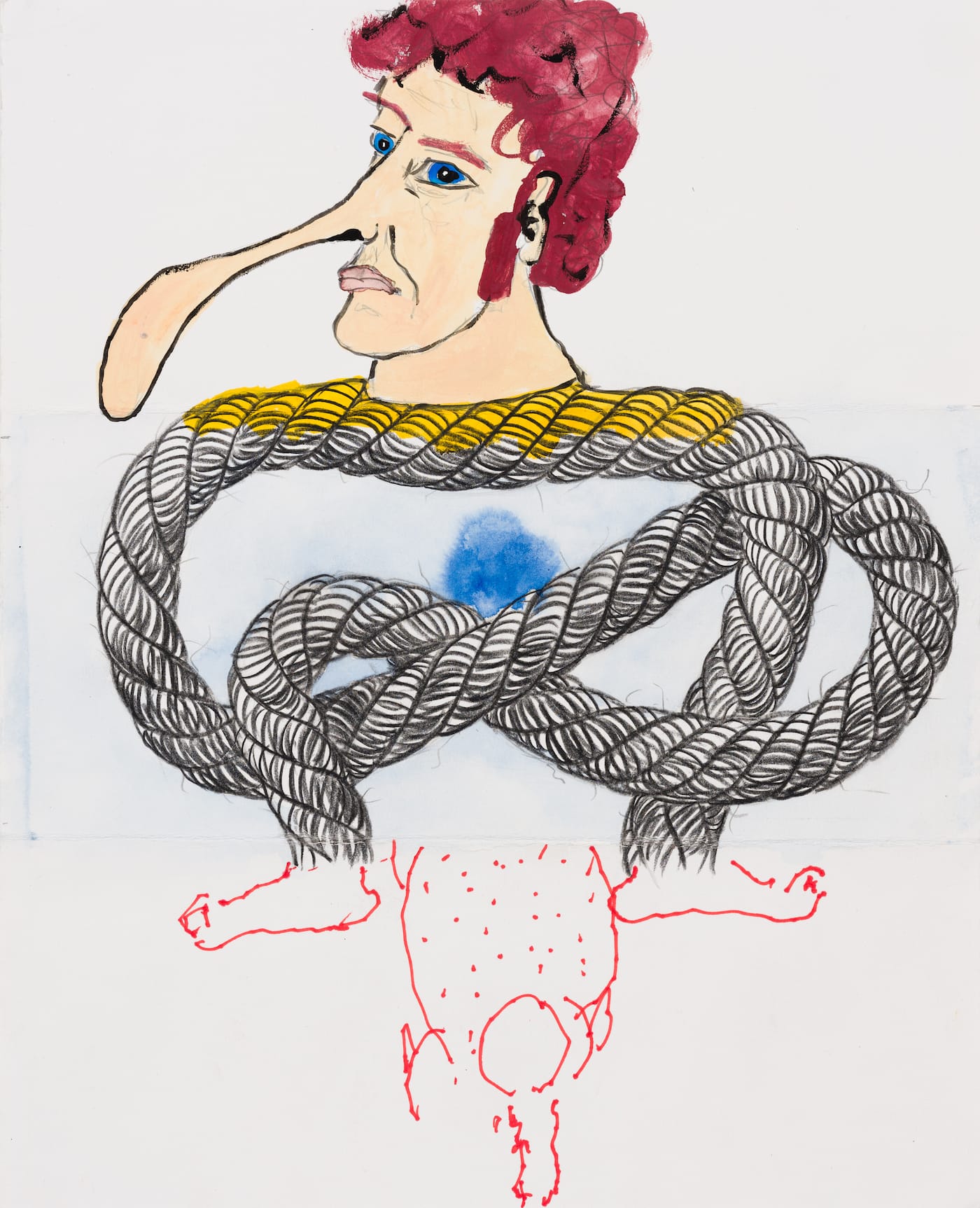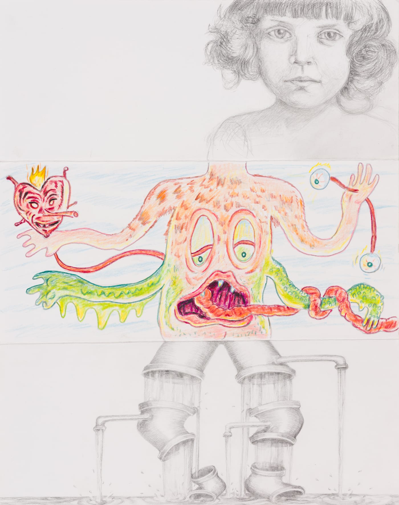 Bowman attended art school in San Francisco before moving to LA, where she worked for James Corcoran and began curating shows at punk haunt/gallery the Zero Club in the late 1980s. In the early ’90s, she relocated to New York, where she fell in with the Lower East Side art and culture scene. The exquisite corpse pulls from both nodes. The second piece in the series features two female visages reminiscent of pulp art by Walter Robinson above Brigitte Engler’s Rorschach-like red and black body, and cartoonish, Simpsons-esque feet by punk pioneer Richard Hell. The first work created (though the last in the book) is topped by LA-based artist and poet Eve Wood's redhead with a surreal, elongated nose, while the middle section is anchored by Claudia Parducci’s drawing of knotted rope. A red ink drawing of two feet straddling a large phallus is by Light & Space artist Peter Alexander, Parducci’s late husband, who encouraged Bowman to take on the project when she proposed it to him.