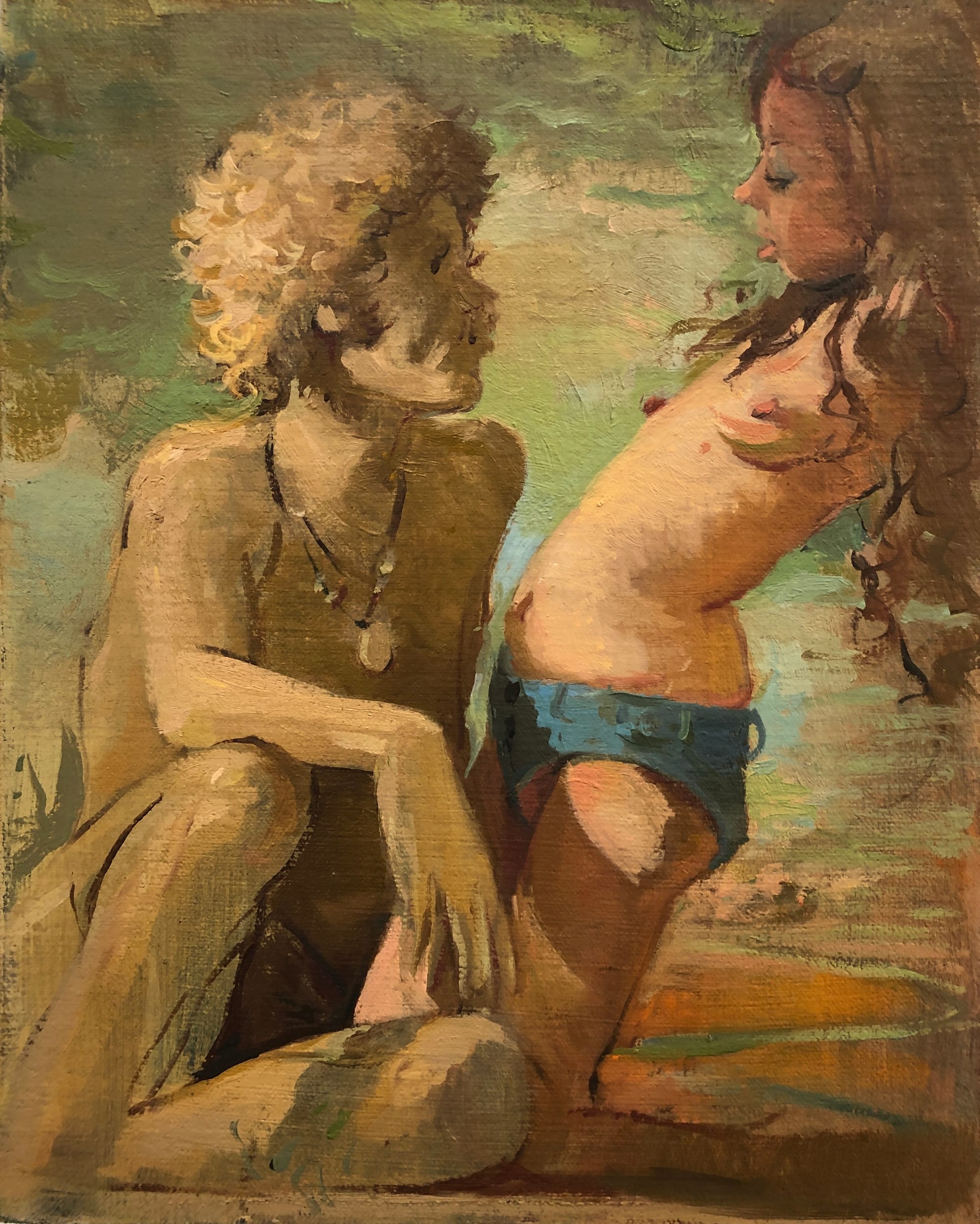 Babie Brood allows us to trace the development of several of the new large paintings from the small studies — for example, “Golden Couple,” in the uptown show, and “Phil and Eileen,” and “Phillip and Irene” downtown (all 2018). All three paintings feature a blond, frizzy-haired, mustachioed and bare-chested man, bedecked in love beads, and a woman with long, straight blond hair and denim shorts loosely fitted over her thin pelvis. He is half-crouched with right forearm resting on knee and gazing appreciatively at his partner, while she thrusts her taut belly forward and kneels next to him in a favorite Yuskavage pose (reminiscent of the posture in “Sweetpuss”), her rounded back exposing her small, bare breasts.