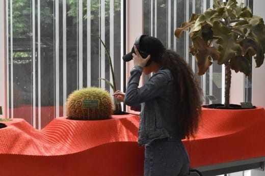 But that coverage sidesteps discussion of the exhibition’s aesthetics, which don’t live up to the work’s promising conceit. Whereas other botanical sound artists, such as Mileece, translate plant sounds into poetic soundscapes, Adar works in a documentary register. This vérité approach does convey a novel acoustic sense of the physical interiors of succulents, many of which have thick outer walls and hollow interiors. However, visitors can only hear plant sounds through headphones when we touch the plants, which creates the sense that we are listening to a human interacting with plants rather than to the plants themselves.