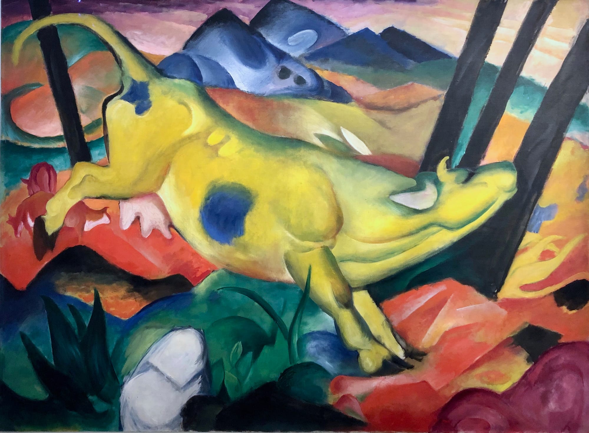 The Blue Rider was the first exhibition to twin the concepts of abstract art and abstract music, two non-representational forms that would captivate artists and the art world right through to the 21st century. Blue — the deeper the better — was for Kandinsky the most spiritual color. He worked closely with his friend, the painter Franz Marc, as well as radical composers Arnold Schoenberg and Alexander Scriabin, who sought to express the abstraction and divinity of color in their music. The drive toward this ideal of fusion in the arts or Gesamtkunstwerk was in the air at the time. The composers called their work color experiments; others called it dissonant painting. That term was closer to what Kandinsky, who wrote a treatise on sound and color in the form of a a stage composition, The Yellow Sound, might have had in mind for The Blue Rider arts collective.