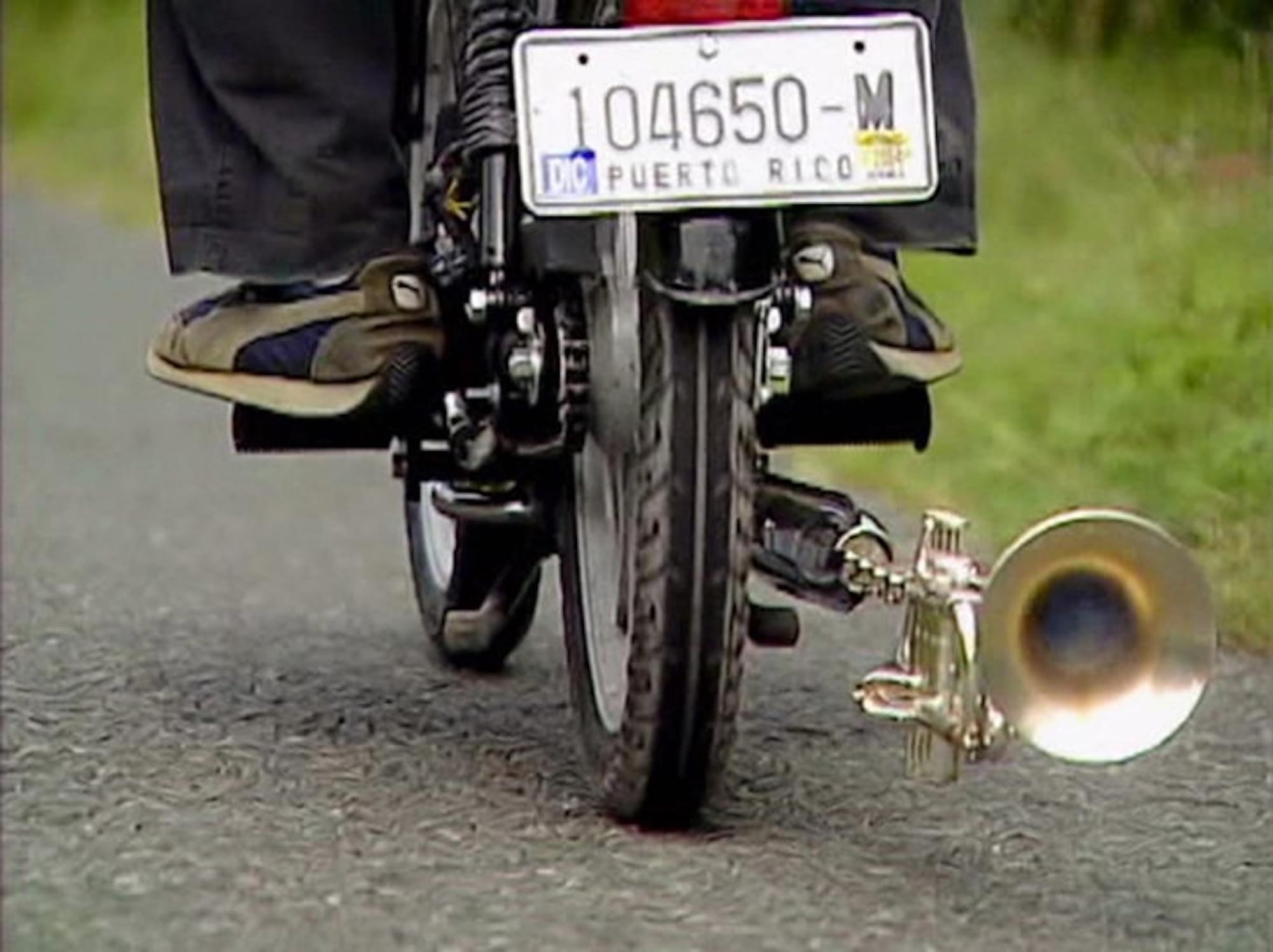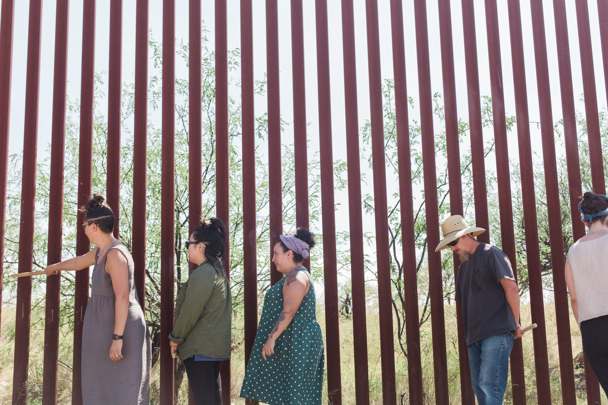 Many works on view are overtly political. A video piece titled “Returning a Sound” from artists Guillermo Calzadilla and Jennifer Allora follows a figure on a moped around the satellite island of Vieques, Puerto Rico. The video shows a trumpet attached to the muffler, producing a loud droning meant to recall and replace the familiar sound of exploding bombs heard around Vieques for nearly 60 years during the island’s use as a US military testing ground. As the moped sputters along, the viewer’s awareness drifts to the landscape, the street signage, and the stoic motorcyclist. Entranced by the steady rumble of the trumpet, the viewer is left to contemplate the island and its history. Nearby, a recording shows Ambos Project artists striking the US-Mexico border wall like a percussive instrument in “96 Deaths” (2017) — a performance honoring the lives of those who have died due to militarization at the Southern Arizona border. Repetitive sound in both of these works allows the viewer to enter a contemplative state in which they can reflect upon these oppressive histories.