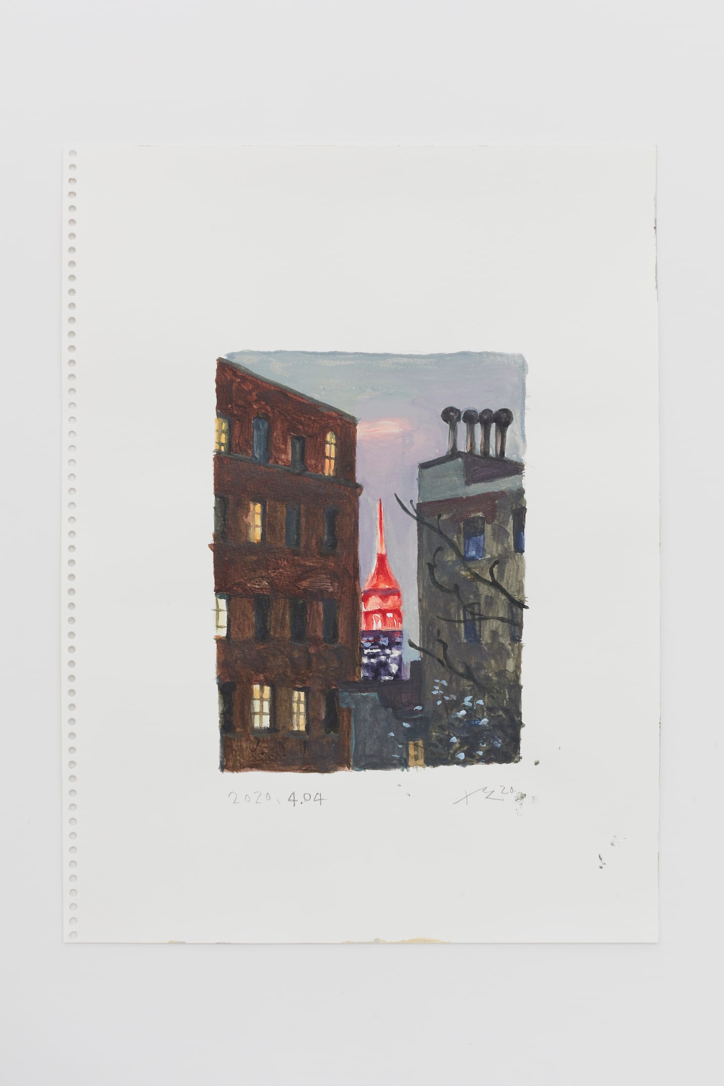 Liu’s eye for an understated but dramatic view is further enhanced by his masterful sense of spacing and keen sensitivity to color. He might be painting while sitting on the balcony of the apartment where he and his family are staying, or while outside, but it never seems that the world is too much with him; he is both responding to the immediate circumstance and in control. There is nothing hurried about the looking or the doing, which adds to the meaning of these works. Even in this acute moment in our history, he is able to slow down his looking to find and celebrate the beauty of human determination, as well as recognize feelings of wariness and displacement.