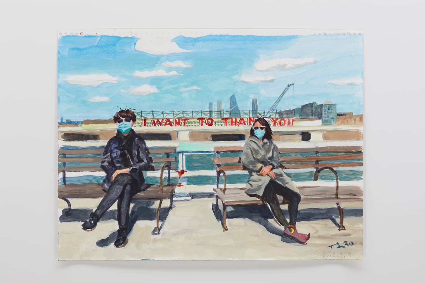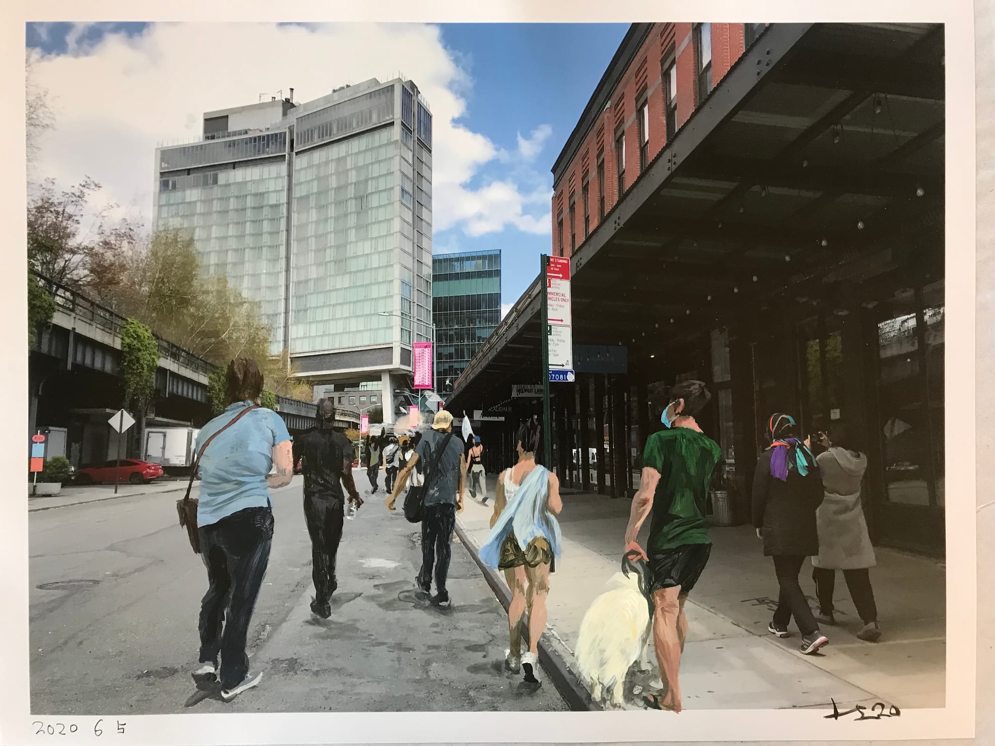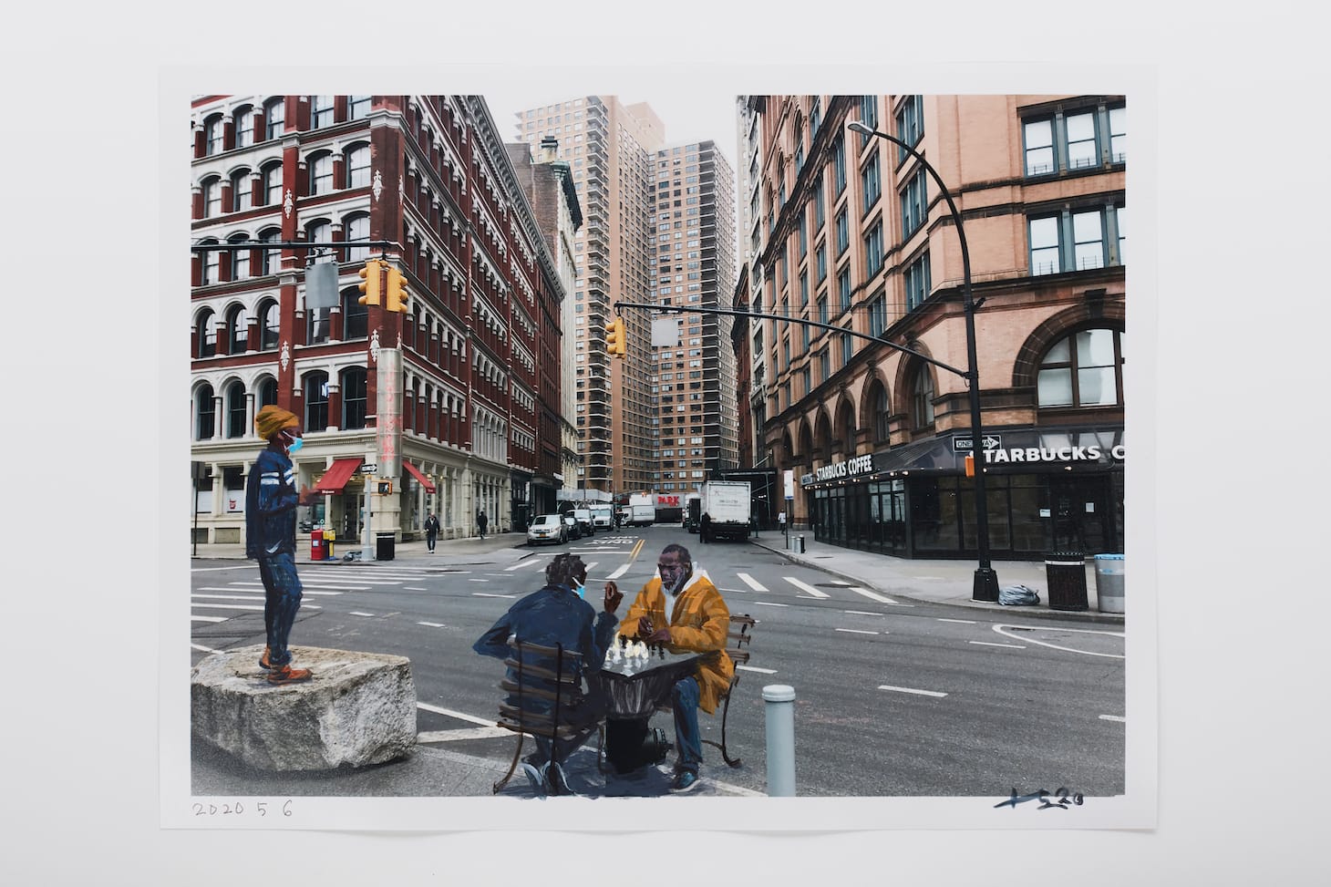 In his current online exhibition, Liu Xiaodong: Spring in New York at Lisson Gallery (through July 12) — which includes watercolors, photographs he has taken and painted over, and a diary — we are given a visual and written record of a specific area of Manhattan, determined by what he can walk to. Liu made his watercolors during an extreme period in New York’s history, starting with the empty streets during the first months of the COVID-19 quarantine, and including the Black Lives Matter protests and demonstrations in response to the video-recorded murder of George Floyd. It is an ongoing project — each work is dated — determined by the length of time he and his family are stranded in New York.