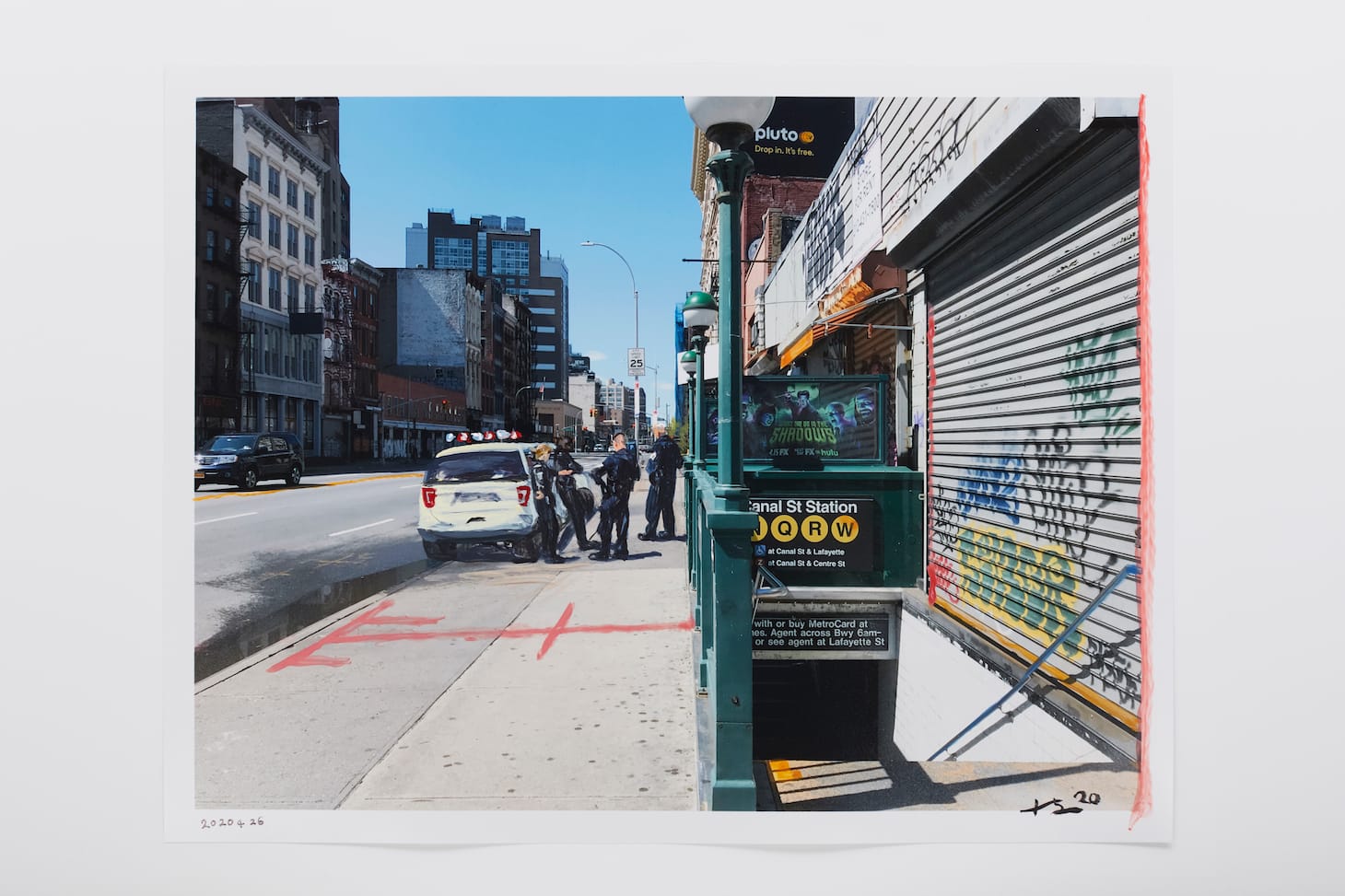 In the photographs that he has painted over, I felt that he was painting something he had remembered or, perhaps, had seen in another photograph of the same scene. For “Beatles plus One,” dated June 4, 2020, Liu begins with a C-print of an empty street, and paints five policeman in various postures, masked and unmasked, crossing the intersection from right to left. The work’s title refers to the famous photograph of the Beatles striding in a line across Abbey Road, from left to right. If Liu is being critical of their slovenly attitude, it is with a light hand. If anything, the policemen look rather ill-prepared and a tad pathetic, perhaps even apprehensive of what awaits them.