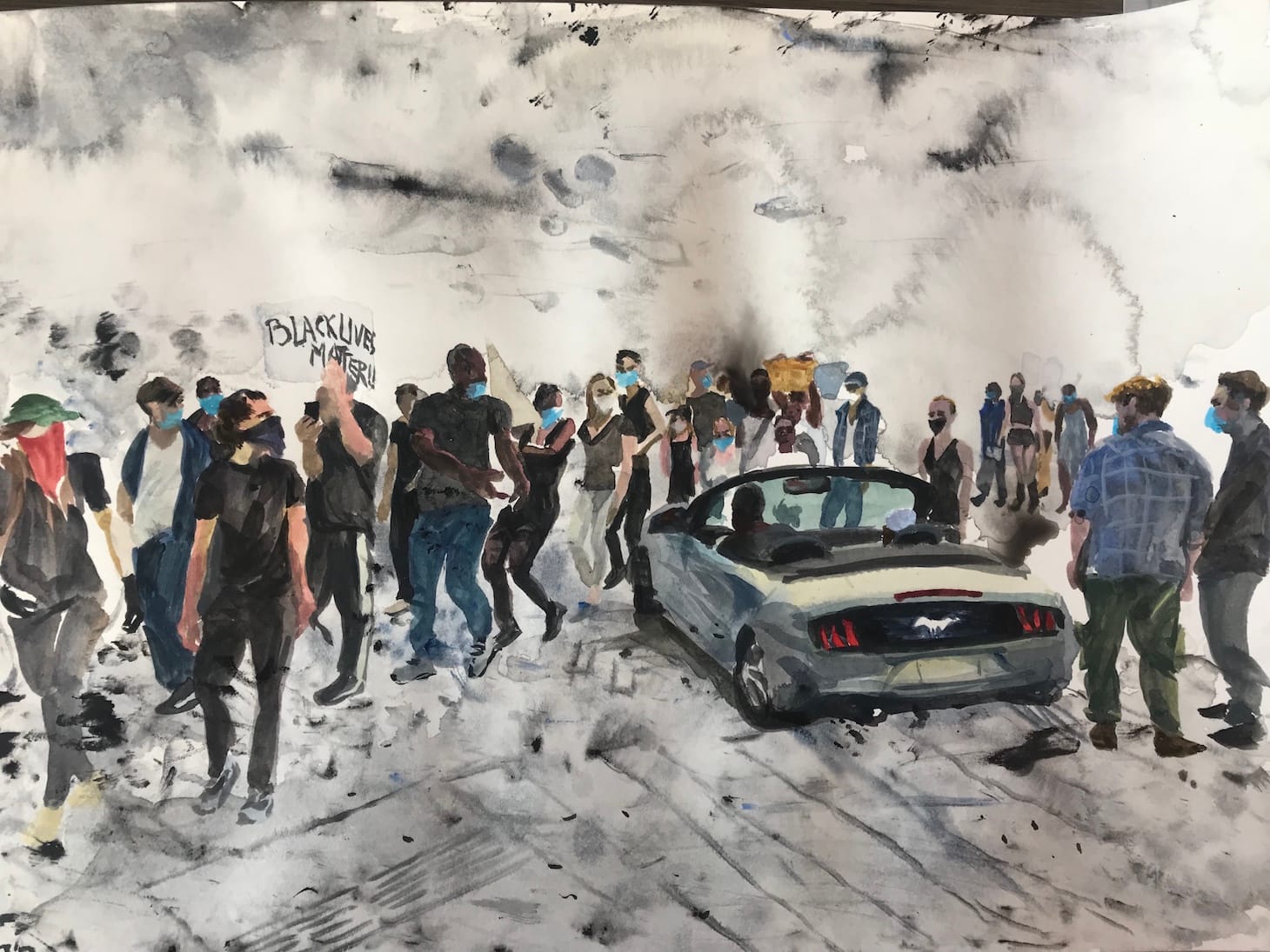 As Manhattan transitioned from the largely empty streets of the quarantine to demonstrations and large groups of police, Liu kept looking, kept going out, and kept making watercolors and taking photographs, to work on later. His attention to detail, to the color and light, is masterful and precise.