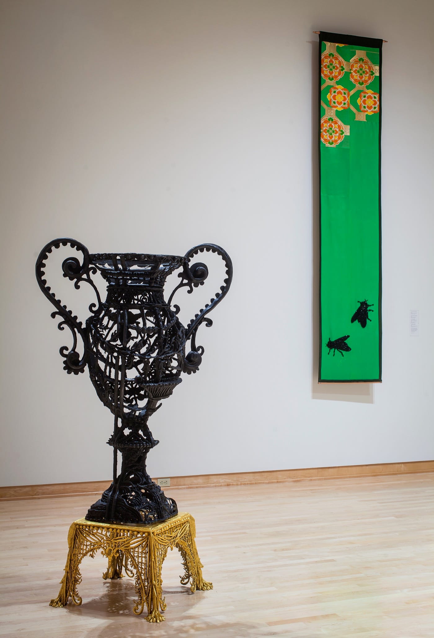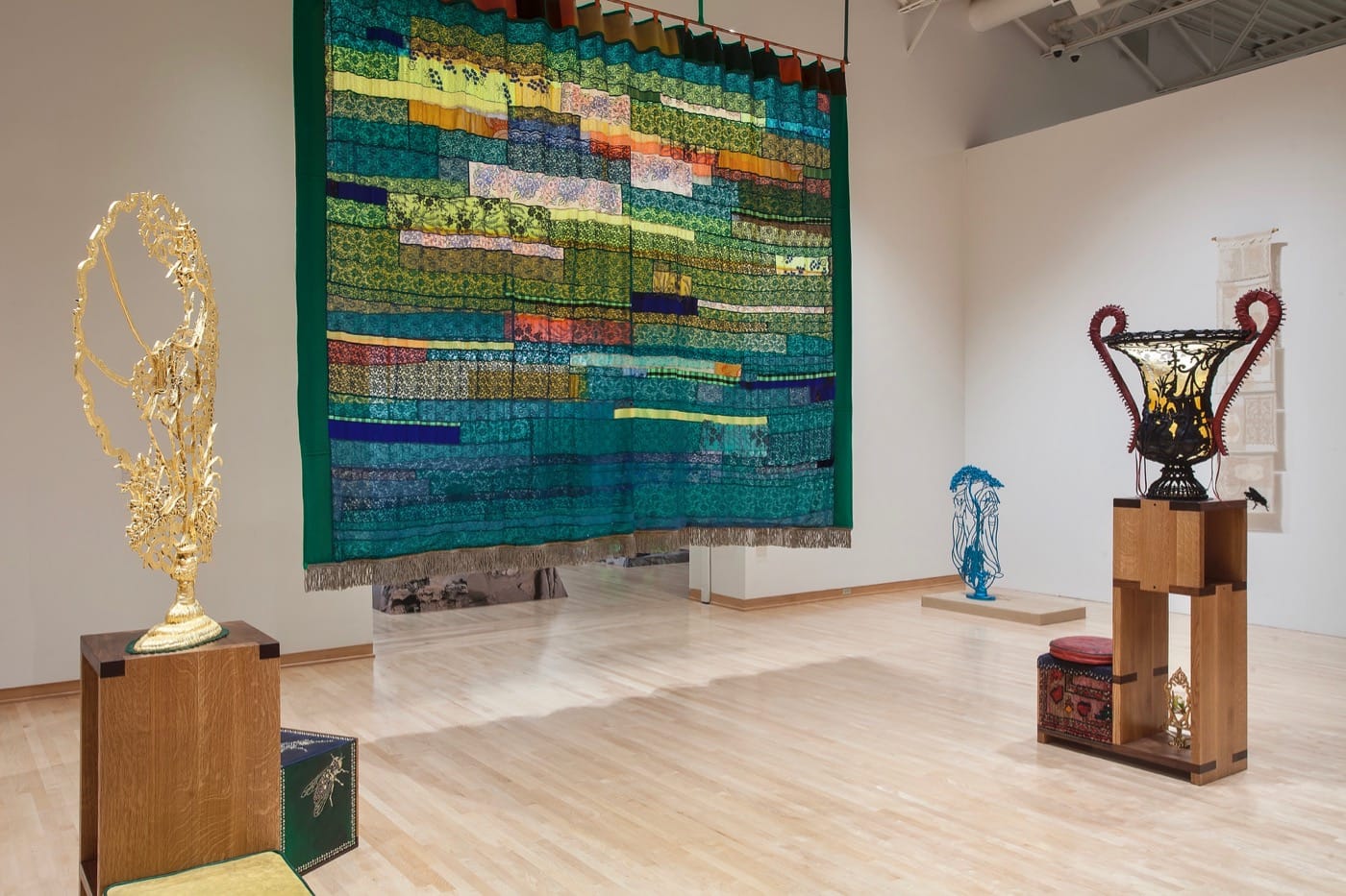 Curling into the adjacent room I came upon the most beautiful pieces within the entire suite of exhibitions: Dark Matter: Joel Otterson. The cavernous room is filled with fantastically lovely hanging tapestries, spectacularly-colored brass pieces that look like the armature of vases, and wooden sculptures shaped like boxes and low tables. Otterson combines an array of materials including leather, black tourmaline, corals, 24k gold leaf, silk, black glass, onyx, spinel beads, copper pipe, and embroidered velvet. The pieces all together form a kind of showroom suggesting a decorating scheme that is both wildly intuitive and carefully precise.